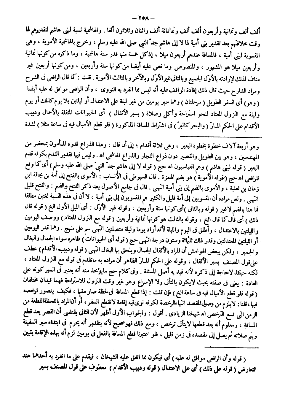 وَالْهَاشِمِيَّةُ نِسْبَةٌ لِبَنِي هَاشِمٍ لِتَقْدِيرِهِمْ لَهَا وَقْتَ خِلَافَتِهِمْ بَعْدَ تَقْدِيرِ بَنِي أُمَيَّةَ لَهَا لَا إلَى هَاشِمٍ جَدِّ النَّبِيِّ - صَلَّى اللَّهُ عَلَيْهِ وَسَلَّمَ -، وَخَرَجَ بِالْهَاشِمِيَّةِ الْأُمَوِيَّةُ، وَهِيَ الْمَنْسُوبَةُ لِبَنِي أُمَيَّةَ، فَالْمَسَافَةُ عِنْدَهُمْ أَرْبَعُونَ مِيلًا، إذْ كُلُّ خَمْسَةٍ مِنْهَا قَدْرُ سِتَّةٍ هَاشِمِيَّةٍ، وَمَا ذَكَرَهُ مِنْ كَوْنِهَا ثَمَانِيَةً وَأَرْبَعِينَ مِيلًا هُوَ الْمَشْهُورُ، وَالْمَنْصُوصُ وَمَا نُصَّ عَلَيْهِ أَيْضًا مِنْ كَوْنِهَا سِتَّةً وَأَرْبَعِينَ، وَمِنْ كَوْنِهَا أَرْبَعِينَ غَيْرُ مُنَافٍ لِذَلِكَ لِإِرَادَتِهِ بِالْأَوَّلِ الْجَمِيعَ وَبِالثَّانِي غَيْرَ الْأَوَّلِ وَبِالْآخِرِ وَبِالثَّالِثِ الْأُمَوِيَّةَ.