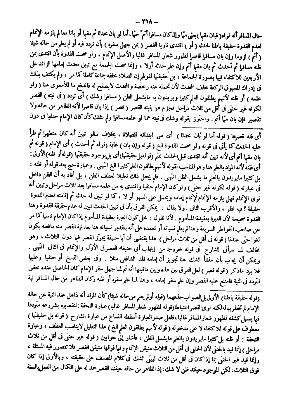 ـــــــــــــــــــــــــــــQقَوْلُهُ: حَقِيقَةً بَاطِنًا) الْأَوْلَى بَلْ الصَّوَابُ حَذْفُهُمَا (قَوْلُهُ: أَوْ لَمْ يَعْلَمْ مِنْ حَالِهِ شَيْئًا) كَأَنَّ الْمُرَادَ أَنَّهُ ذَاهِلٌ عِنْدَ النِّيَّةِ عَنْ حَالَةِ الْإِمَامِ لَمْ تَخْطِرْ بِبَالِهِ لَكِنَّهُ نَوَى الْقَصْرَ اعْتِبَاطًا (قَوْلُهُ: لِظُهُورِ شِعَارِ الْمُسَافِرِ غَالِبًا) عِبَارَةُ التُّحْفَةِ: لِقَصِيرِهِ بِشُرُوعِهِ مُتَرَدِّدًا فِيمَا يَسْهُلُ كَشْفُهُ لِظُهُورِ شِعَارِ الْمُسَافِرِ غَالِبًا، فَلَعَلَّ صَدْرَ الْعِبَارَةِ أَسْقَطَهُ النُّسَّاخُ مِنْ عِبَارَةِ الشَّارِحِ (قَوْلُهُ: بَلْ حَقِيقَتُهَا) مَعْطُوفٌ عَلَى قَوْلِهِ لِلِاكْتِفَاءِ لَا عَلَى مَدْخُولِهِ (قَوْلُهُ: لِأَنَّهُمْ يُطْلِقُونَ الْعِلْمَ إلَخْ) هَذَا التَّعْلِيلُ لَا يُنَاسِبُ الْعَطْفَ، وَعِبَارَةُ التُّحْفَةِ: أَوْ ظَنَّهُ بَلْ كَثِيرًا مَا يُرِيدُونَ بِالْعِلْمِ مَا يَشْمَلُ الظَّنَّ، فَأَشَارَ إلَى جَوَابَيْنِ (قَوْلُهُ: غَيْرَ حَنَفِيٍّ فِي أَقَلَّ مِنْ ثَلَاثِ مَرَاحِلَ) إنَّمَا قَيَّدَ بِالْحَنَفِيِّ؛ لِأَنَّ الْحَنَفِيَّ فِي أَقَلِّ مِنْ الثَّلَاثِ مُتَيَقِّنُ الْإِتْمَامِ وَفِيمَا فَوْقَهَا مُتَيَقِّنُ الْقَصْرِ فَلَا تُتَصَوَّرُ فِيهِ الْمَسْأَلَةُ، وَإِنَّمَا قَيَّدَ غَيْرَ الْحَنَفِيِّ بِمَا إذَا كَانَ فِي أَقَلَّ مِنْ ثَلَاثٍ لِيَبْقَى الشَّكُّ فِي كَلَامِ الْمُصَنِّفِ عَلَى حَقِيقَتِهِ، وَبِالْأَوْلَى إذَا كَانَ فَوْقَ الثَّلَاثِ، لَكِنَّ الْمَوْجُودَ حِينَئِذٍ ظَنٌّ لَا شَكٌّ، إذْ الظَّاهِرُ مِنْ حَالِهِ حِينَئِذٍ الْقَصْرُ حُمِدَ لَهُ عَلَى الْكَمَالِ مِنْ الْعَمَلِ بِالسُّنَّةِ