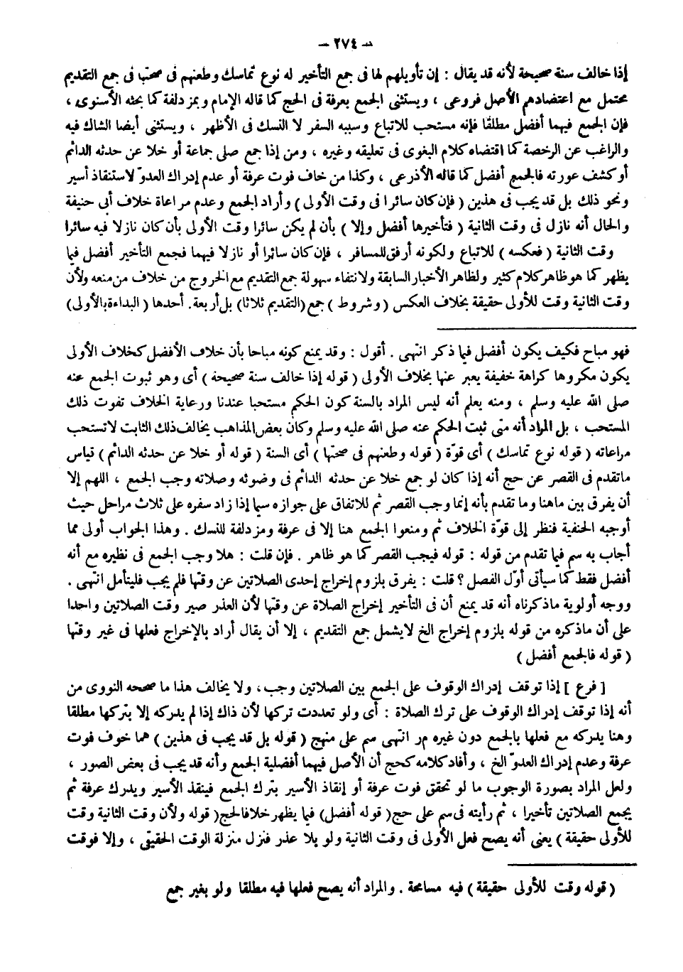 إذَا خَالَفَ سُنَّةً صَحِيحَةً؛ لِأَنَّهُ قَدْ يُقَالُ: إنَّ تَأْوِيلَهُمْ لَهَا فِي جَمْعِ التَّأْخِيرِ لَهُ نَوْعُ تَمَاسُكٍ وَطَعْنُهُمْ فِي صِحَّتِهَا فِي جَمْعِ التَّقْدِيمِ مُحْتَمَلٌ مَعَ اعْتِضَادِهِمْ الْأَصْلَ فَرُوعِيَ، وَيُسْتَثْنَى الْجَمْعُ بِعَرَفَةَ فِي الْحَجِّ كَمَا قَالَهُ الْإِمَامُ وَبِمُزْدَلِفَةَ كَمَا بَحَثَهُ الْإِسْنَوِيُّ، فَإِنَّ الْجَمْعَ فِيهِمَا أَفْضَلُ مُطْلَقًا فَإِنَّهُ مُسْتَحَبٌّ لِلِاتِّبَاعِ وَسَبَبُهُ السَّفَرُ لَا النُّسُكُ فِي الْأَظْهَرِ، وَيُسْتَثْنَى أَيْضًا الشَّاكُّ فِيهِ وَالرَّاغِبُ عَنْ الرُّخْصَةِ اقْتَضَاهُ كَلَامُ الْبَغَوِيّ فِي تَعْلِيقِهِ وَغَيْرِهِ، وَمَنْ إذَا جَمَعَ صَلَّى جَمَاعَةً أَوْ خَلَا عَنْ حَدَثِهِ الدَّائِمِ أَوْ كَشَفَ عَوْرَتَهُ فَالْجَمْعُ أَفْضَلُ كَمَا قَالَهُ الْأَذْرَعِيُّ، وَكَذَا مَنْ خَافَ فَوْتَ عَرَفَةَ أَوْ عَدَمَ إدْرَاكِ الْعَدُوِّ لِاسْتِنْقَاذِ أَسِيرٍ وَنَحْوُ ذَلِكَ بَلْ قَدْ يَجِبُ فِي هَذَيْنِ (فَإِنْ كَانَ سَائِرًا فِي وَقْتِ الْأُولَى) وَأَرَادَ الْجَمْعَ وَعَدَمَ مُرَاعَاةِ خِلَافِ أَبِي حَنِيفَةَ وَالْحَالُ أَنَّهُ نَازِلٌ فِي وَقْتِ الثَّانِيَةِ (فَتَأْخِيرُهَا أَفْضَلُ وَإِلَّا) بِأَنْ لَمْ يَكُنْ سَائِرًا وَقْتَ الْأُولَى بِأَنْ كَانَ نَازِلًا فِيهِ سَائِرًا وَقْتَ الثَّانِيَةِ (فَعَكْسُهُ) لِلِاتِّبَاعِ وَلِكَوْنِهِ أَرْفَقَ لِلْمُسَافِرِ، فَإِنْ كَانَ سَائِرًا أَوْ نَازِلًا فِيهِمَا فَجَمْعُ التَّأْخِيرِ أَفْضَلُ فِيمَا يَظْهَرُ كَمَا هُوَ ظَاهِرُ كَلَامِ كَثِيرٍ وَلِظَاهِرِ الْأَخْبَارِ السَّابِقَةِ وَلِانْتِفَاءِ سُهُولَةِ جَمْعِ التَّقْدِيمِ مَعَ الْخُرُوجِ مِنْ خِلَافِ مَنْ مَنَعَهُ وَلِأَنَّ وَقْتَ الثَّانِيَةِ وَقْتٌ لِلْأُولَى حَقِيقَةً بِخِلَافِ الْعَكْسِ.