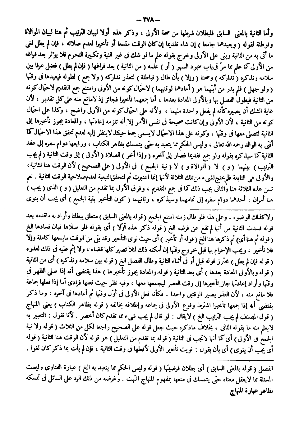 وَرَابِعُهَا دَوَامُ سَفَرِهِ إلَى عَقْدِ الثَّانِيَةِ كَمَا سَيَذْكُرُهُ بِقَوْلِهِ وَلَوْ جَمَعَ تَقْدِيمًا فَصَارَ إلَى آخِرِهِ (وَإِذَا أَخَّرَ) الصَّلَاةَ (الْأُولَى) إلَى وَقْتِ الثَّانِيَةِ (لَمْ يَجِبْ التَّرْتِيبُ) بَيْنَهُمَا (وَ) لَا (الْمُوَالَاةُ وَ) لَا (نِيَّةَ الْجَمْعِ) فِي الْأُولَى (عَلَى الصَّحِيحِ) ؛ لِأَنَّ الْوَقْتَ هُنَا لِلثَّانِيَةِ، وَالْأُولَى هِيَ التَّابِعَةُ فَلَمْ يَحْتَجْ لِشَيْءٍ مِنْ تِلْكَ الثَّلَاثَةِ؛ لِأَنَّهَا إنَّمَا اُعْتُبِرَتْ ثَمَّ لِتَحَقُّقِ التَّبَعِيَّةِ لِعَدَمِ صَلَاحِيَّةِ الْوَقْتِ لِلثَّانِيَةِ. نَعَمْ تُسَنُّ هَذِهِ الثَّلَاثَةُ هُنَا وَالثَّانِي يَجِبُ ذَلِكَ كَمَا فِي جَمْعِ التَّقْدِيمِ، وَفَرْقُ الْأَوَّلِ بِمَا تَقَدَّمَ مِنْ التَّعْلِيلِ (وَ) الَّذِي (يَجِبُ) هُنَا أَمْرَانِ: أَحَدُهُمَا دَوَامُ سَفَرِهِ إلَى تَمَامِهِمَا وَسَيَذْكُرُهُ، وَثَانِيهِمَا (كَوْنُ التَّأْخِيرِ بِنِيَّةِ الْجَمْعِ) أَيْ يَجِبُ أَنْ يَنْوِيَ