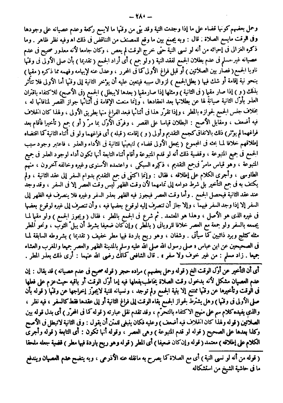وَحَمَلَ بَعْضُهُمْ كَوْنَهَا قَضَاءً عَلَى مَا إذَا وُجِدَتْ النِّيَّةُ وَقَدْ بَقِيَ مِنْ وَقْتِهِ مَا لَا يَسَعُ رَكْعَةً، وَعَدَمَ عِصْيَانِهِ عَلَى وُجُودِهَا وَفِي الْوَقْتِ مَا يَسَعُ الصَّلَاةَ: قَالَ: وَبِهِ يُجْمَعُ بَيْنَ مَا وَقَعَ لِلْمُصَنِّفِ مِنْ التَّنَاقُضِ فِي ذَلِكَ اهـ وَفِيهِ نَظَرٌ ظَاهِرٌ. وَمَا ذَكَرَهُ الْغَزَالِيُّ فِي إحْيَائِهِ مِنْ أَنَّهُ لَوْ نَسِيَ النِّيَّةَ حَتَّى خَرَجَ الْوَقْتُ لَمْ يَعْصِ، وَكَانَ جَامِعًا؛ لِأَنَّهُ مَعْذُورٌ صَحِيحٌ فِي عَدَمِ عِصْيَانِهِ غَيْرُ مُسَلَّمٍ فِي عَدَمِ بُطْلَانِ الْجَمْعِ لِفَقْدِ النِّيَّةِ (وَلَوْ جَمَعَ) أَيْ أَرَادَ الْجَمْعَ (تَقْدِيمًا) بِأَنْ صَلَّى الْأُولَى فِي وَقْتِهَا نَاوِيًا الْجَمْعَ (فَصَارَ بَيْنَ الصَّلَاتَيْنِ) أَوْ قَبْلَ فَرَاغِ الْأُولَى كَمَا فِي الْمُحَرَّرِ، وَعَدَلَ عَنْهُ لِإِيهَامِهِ وَفَهْمِهِ مِمَّا ذَكَرَهُ (مُقِيمًا) بِنَحْوِ نِيَّةِ إقَامَةٍ أَوْ شَكٍّ فِيهَا (بَطَلَ الْجَمْعُ) لِزَوَالِ سَبَبِهِ فَيَتَعَيَّنُ عَلَيْهِ أَنْ يُؤَخِّرَ الثَّانِيَةَ إلَى وَقْتِهَا أَمَّا الْأُولَى فَلَا تَتَأَثَّرُ بِذَلِكَ.
