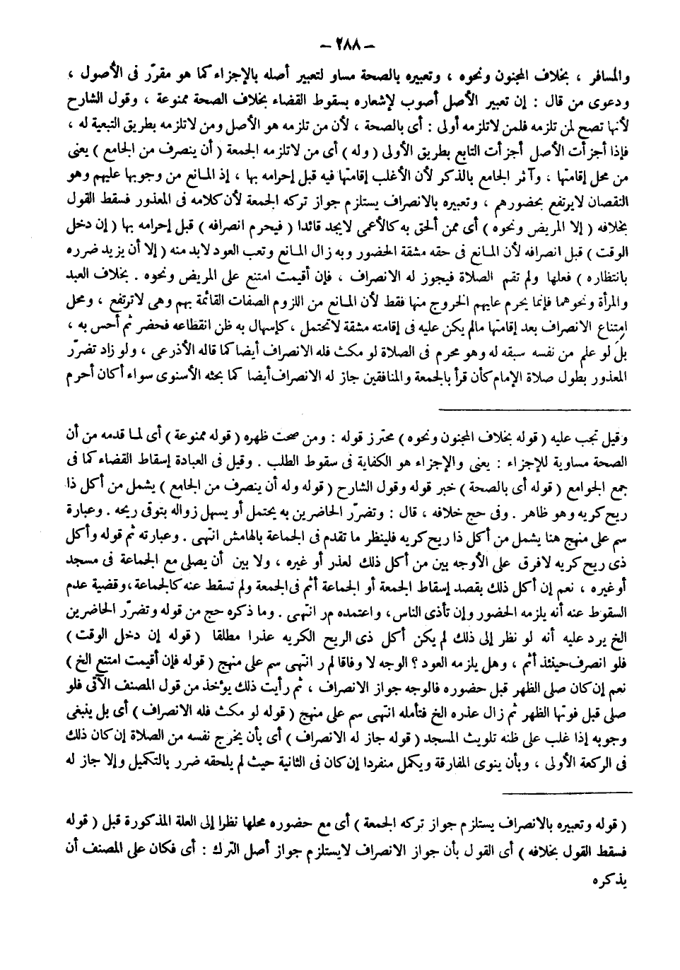 وَالْمُسَافِرِ، بِخِلَافِ الْمَجْنُونِ وَنَحْوِهِ، وَتَعْبِيرُهُ بِالصِّحَّةِ مُسَاوٍ لِتَعْبِيرِ أَصْلِهِ بِالْإِجْزَاءِ كَمَا هُوَ مُقَرَّرٌ فِي الْأُصُولِ، وَدَعْوَى مَنْ قَالَ: إنَّ تَعْبِيرَ الْأَصْلِ أَصْوَبُ لِإِشْعَارِهِ بِسُقُوطِ الْقَضَاءِ بِخِلَافِ الصِّحَّةِ مَمْنُوعَةٌ، وَقَوْلُ الشَّارِحِ لِأَنَّهَا تَصِحُّ لِمَنْ تَلْزَمُهُ فَلِمَنْ لَا تَلْزَمُهُ أَوْلَى: أَيْ بِالصِّحَّةِ، لِأَنَّ مَنْ تَلْزَمُهُ هُوَ الْأَصْلُ وَمَنْ لَا تَلْزَمُهُ بِطَرِيقِ التَّبَعِيَّةِ لَهُ، فَإِذَا أَجْزَأْت الْأَصْلَ أَجْزَأْت التَّابِعَ بِطَرِيقِ الْأَوْلَى (وَلَهُ) أَيْ مَنْ لَا تَلْزَمُهُ الْجُمُعَةُ (أَنْ يَنْصَرِفَ مِنْ الْجَامِعِ) يَعْنِي مِنْ مَحَلِّ إقَامَتِهَا، وَآثَرَ الْجَامِعَ بِالذِّكْرِ لِأَنَّ الْأَغْلَبَ إقَامَتُهَا فِيهِ قَبْلَ إحْرَامِهِ بِهَا، إذْ الْمَانِعُ مِنْ وُجُوبِهَا عَلَيْهِمْ وَهُوَ النُّقْصَانُ لَا يَرْتَفِعُ بِحُضُورِهِمْ، وَتَعْبِيرُهُ بِالِانْصِرَافِ: يَسْتَلْزِمُ جَوَازُ تَرْكِهِ الْجُمُعَةَ لِأَنَّ كَلَامَهُ فِي الْمَعْذُورِ فَسَقَطَ الْقَوْلُ بِخِلَافِهِ (إلَّا الْمَرِيضَ وَنَحْوَهُ) أَيْ مِمَّنْ أُلْحِقَ بِهِ كَالْأَعْمَى لَا يَجِدُ قَائِدًا (فَيَحْرُمُ انْصِرَافُهُ) قَبْلَ إحْرَامِهِ بِهَا (إنْ دَخَلَ الْوَقْتُ) قَبْلَ انْصِرَافِهِ لِأَنَّ الْمَانِعَ فِي حَقِّهِ مَشَقَّةُ الْحُضُورِ وَبِهِ زَالَ الْمَانِعُ وَتَعَبُ الْعَوْدِ لَا بُدَّ مِنْهُ (إلَّا أَنْ يَزِيدَ ضَرَرُهُ بِانْتِظَارِهِ) فِعْلَهَا وَلَمْ تَقُمْ الصَّلَاةُ فَيَجُوزُ لَهُ الِانْصِرَافُ، فَإِنْ أُقِيمَتْ امْتَنَعَ عَلَى الْمَرِيضِ وَنَحْوِهِ. بِخِلَافِ الْعَبْدِ وَالْمَرْأَةِ وَنَحْوِهِمَا فَإِنَّمَا يَحْرُمُ عَلَيْهِمْ الْخُرُوجُ مِنْهَا فَقَطْ لِأَنَّ الْمَانِعَ مِنْ اللُّزُومِ الصِّفَاتُ الْقَائِمَةُ بِهِمْ وَهِيَ لَا تَرْتَفِعُ، وَمَحَلُّ امْتِنَاعِ الِانْصِرَافِ بَعْدَ إقَامَتِهَا مَا لَمْ يَكُنْ عَلَيْهِ فِي إقَامَتِهِ مَشَقَّةٌ لَا تُحْتَمَلُ، كَإِسْهَالٍ بِهِ ظَنَّ انْقِطَاعَهُ فَحَضَرَ ثُمَّ أَحَسَّ بِهِ، بَلْ لَوْ عَلِمَ مِنْ نَفْسِهِ سَبْقَهُ لَهُ وَهُوَ مُحْرِمٌ فِي الصَّلَاةِ لَوْ مَكَثَ فَلَهُ الِانْصِرَافُ أَيْضًا كَمَا قَالَهُ الْأَذْرَعِيُّ.