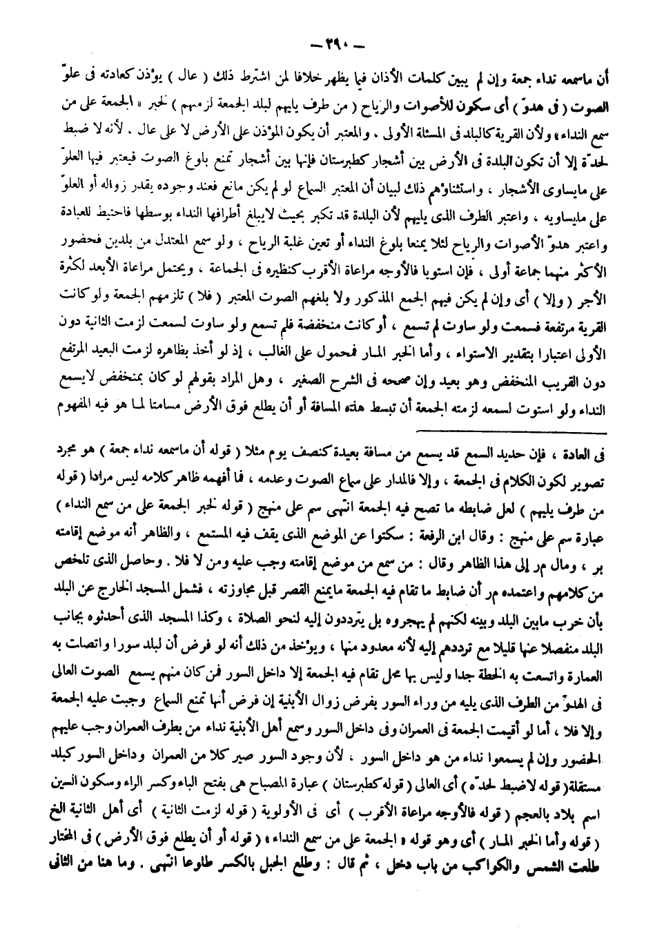 وَحَاصِلُ الَّذِي تَلَخَّصَ مِنْ كَلَامِهِمْ وَاعْتَمَدَهُ م ر أَنَّ ضَابِطَ مَا تُقَامُ فِيهِ الْجُمُعَةُ مَا يُمْنَعُ الْقَصْرُ قَبْلَ مُجَاوَزَتِهِ، فَشَمَلَ الْمَسْجِدَ الْخَارِجَ عَنْ الْبَلَدِ بِأَنْ خَرِبَ مَا بَيْنَ الْبَلَدِ وَبَيْنَهُ لَكِنَّهُمْ لَمْ يَهْجُرُوهُ بَلْ يَتَرَدَّدُونَ إلَيْهِ لِنَحْوِ الصَّلَاةِ، وَكَذَا الْمَسْجِدُ الَّذِي أَحْدَثُوهُ بِجَانِبِ الْبَلَدِ مُنْفَصِلًا عَنْهَا قَلِيلًا مَعَ تَرَدُّدِهِمْ إلَيْهِ لِأَنَّهُ مَعْدُودٌ مِنْهَا، وَيُؤْخَذُ مِنْ ذَلِكَ أَنَّهُ لَوْ فُرِضَ أَنَّ لِبَلَدٍ سُورًا وَاتَّصَلَتْ بِهِ الْعِمَارَةُ وَاتَّسَعَتْ بِهِ الْخُطَّةُ جِدًّا وَلَيْسَ بِهَا مَحَلٌّ تُقَامُ فِيهِ الْجُمُعَةُ إلَّا دَاخِلَ السُّورِ فَمَنْ كَانَ مِنْهُمْ يَسْمَعُ الصَّوْتَ الْعَالِيَ فِي الْهُدُوِّ مِنْ الطَّرَفِ الَّذِي يَلِيهِ مِنْ وَرَاءِ السُّورِ بِفَرْضِ زَوَالِ الْأَبْنِيَةِ إنْ فُرِضَ أَنَّهَا تَمْنَعُ السَّمَاعَ وَجَبَتْ عَلَيْهِ الْجُمُعَةُ وَإِلَّا فَلَا، أَمَّا لَوْ أُقِيمَتْ الْجُمُعَةُ فِي الْعُمْرَانِ وَفِي دَاخِلِ السُّورِ وَسَمِعَ أَهْلُ الْأَبْنِيَةِ نِدَاءَ مَنْ بِطَرَفِ الْعُمْرَانِ وَجَبَ عَلَيْهِمْ الْحُضُورُ وَإِنْ لَمْ يَسْمَعُوا نِدَاءَ مَنْ هُوَ دَاخِلَ السُّورِ، لِأَنَّ وُجُودَ السُّورِ صَيَّرَ كُلًّا مِنْ الْعُمْرَانِ وَدَاخِلِ السُّورِ كَبَلَدٍ مُسْتَقِلَّةٍ (قَوْلُهُ: لَا ضَبْطَ لَحَدِّهِ) أَيْ الْعَالِي (قَوْلُهُ:) عِبَارَةُ الْمِصْبَاحِ هِيَ بِفَتْحِ الْبَاءِ وَكَسْرِ الرَّاءِ وَسُكُونِ السِّينِ اسْمُ بِلَادٍ بِالْعَجَمِ (قَوْلُهُ فَالْأَوْجَهُ مُرَاعَاةُ الْأَقْرَبِ) أَيْ فِي الْأَوْلَوِيَّةِ (قَوْلُهُ: لَزِمَتْ الثَّانِيَةُ) أَيْ أَهْلَ الثَّانِيَةِ إلَخْ (قَوْلُهُ: وَأَمَّا الْخَبَرُ الْمَارُّ) أَيْ وَهُوَ قَوْلُهُ " الْجُمُعَةُ عَلَى مَنْ سَمِعَ النِّدَاءَ " (قَوْلُهُ: أَوْ أَنْ يَطْلُعَ فَوْقَ الْأَرْضِ) فِي الْمُخْتَارِ طَلَعَتْ الشَّمْسُ وَالْكَوَاكِبُ مِنْ بَابِ دَخَلَ، ثُمَّ قَالَ: وَطُلِعَ الْجَبَلُ بِالْكَسْرِ طُلُوعًا انْتَهَى. وَمَا هُنَا مِنْ الثَّانِي