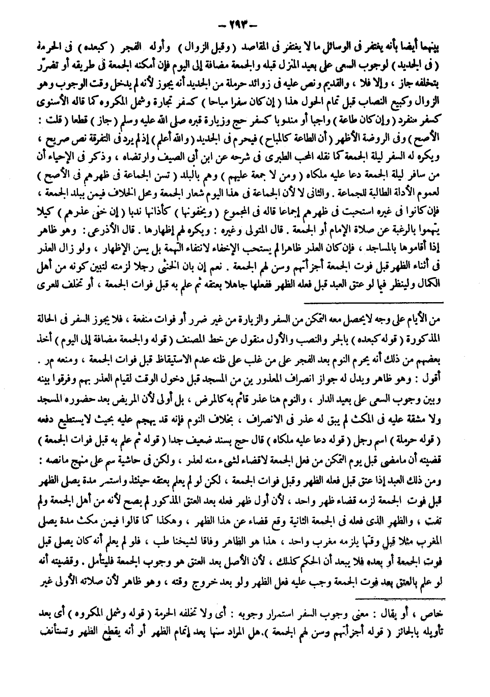 ـــــــــــــــــــــــــــــSمِنْ الْأَيَّامِ عَلَى وَجْهٍ لَا يَحْصُلُ مَعَهُ التَّمَكُّنُ مِنْ السَّفَرِ وَالزِّيَارَةِ مِنْ غَيْرِ ضَرَرٍ أَوْ فَوَاتِ مَنْفَعَةٍ، فَلَا يَجُوزُ السَّفَرُ فِي الْحَالَةِ الْمَذْكُورَةِ (قَوْلُهُ: كَبُعْدِهِ) بِالْجَرِّ وَالنَّصْبِ وَالْأَوَّلُ مَنْقُولٌ عَنْ خَطِّ الْمُصَنِّفِ (قَوْلُهُ وَالْجُمُعَةُ مُضَافَةٌ إلَى الْيَوْمِ) أَخَذَ بَعْضُهُمْ مِنْ ذَلِكَ أَنَّهُ يَحْرُمُ النَّوْمُ بَعْدَ الْفَجْرِ عَلَى مَنْ غَلَبَ عَلَى ظَنِّهِ عَدَمُ الِاسْتِيقَاظِ قَبْلَ فَوَاتِ الْجُمُعَةِ، وَمَنَعَهُ م ر. أَقُولُ: وَهُوَ ظَاهِرٌ وَيَدُلُّ لَهُ جَوَازُ انْصِرَافِ الْمَعْذُورِينَ مِنْ الْمَسْجِدِ قَبْلَ دُخُولِ الْوَقْتِ لِقِيَامِ الْعُذْرِ بِهِمْ وَفَرَّقُوا بَيْنَهُ وَبَيْنَ وُجُوبِ السَّعْيِ عَلَى بَعِيدِ الدَّارِ، وَالنَّوْمُ هُنَا عُذْرٌ قَائِمٌ بِهِ كَالْمَرَضِ، بَلْ أَوْلَى لِأَنَّ الْمَرِيضَ بَعْدَ حُضُورِهِ الْمَسْجِدَ وَلَا مَشَقَّةَ عَلَيْهِ فِي الْمُكْثِ لَمْ يَبْقَ لَهُ عُذْرٌ فِي الِانْصِرَافِ، بِخِلَافِ النَّوْمِ فَإِنَّهُ قَدْ يَهْجُمُ عَلَيْهِ بِحَيْثُ لَا يَسْتَطِيعُ دَفْعُهُ (قَوْلُهُ: حَرْمَلَةَ) اسْمُ رَجُلٍ