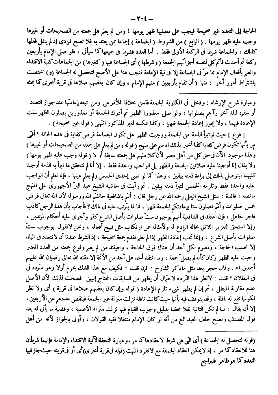 ثُمَّ رَأَيْت فِي حَاشِيَةِ الشَّيْخ عَبْدِ الْبَرِّ الَأُجْهُورِيُّ عَلَى الْمَنْهَجِ مَا نَصُّهُ: فَائِدَةٌ: سَأَلَ الشَّيْخُ الرَّمْلِيُّ - رَحِمَهُ اللَّهُ - عَنْ رَجُلٍ قَالَ: أَنْتُمْ يَا شَافِعِيَّةُ خَالَفْتُمْ اللَّهَ وَرَسُولَهُ لِأَنَّ اللَّهَ تَعَالَى فَرَضَ خَمْسَ صَلَوَاتٍ وَأَنْتُمْ تُصَلُّونَ سِتًّا بِإِعَادَتِكُمْ الْجُمُعَةَ ظُهْرًا، فَمَاذَا يَتَرَتَّبُ عَلَيْهِ فِي ذَلِكَ؟ فَأَجَابَ بِأَنَّ هَذَا الرَّجُلَ كَاذِبٌ فَاجِرٌ جَاهِلٌ، فَإِنْ اعْتَقَدَ فِي الشَّافِعِيَّةِ أَنَّهُمْ يُوجِبُونَ سِتَّ صَلَوَاتٍ بِأَصْلِ الشَّرْعِ كَفَرَ وَأُجْرِيَ عَلَيْهِ أَحْكَامُ الْمُرْتَدِّينَ، وَإِلَّا اسْتَحَقَّ التَّعْزِيرَ اللَّائِقَ بِحَالِهِ الرَّادِعَ لَهُ وَلِأَمْثَالِهِ عَنْ ارْتِكَابِ مِثْلِ قَبِيحِ أَفْعَالِهِ، وَنَحْنُ لَا نَقُولُ بِوُجُوبِ سِتِّ صَلَوَاتٍ بِأَصْلِ الشَّرْعِ، وَإِنَّمَا تَجِبُ إعَادَةُ الظُّهْرِ إذَا لَمْ نَعْلَمْ تَقَدُّمَ جُمُعَةٍ صَحِيحَةٍ، إذْ الشَّرْطُ عِنْدَنَا أَنْ لَا تَتَعَدَّدَ فِي الْبَلَدِ إلَّا بِحَسَبِ الْحَاجَةِ، وَمَعْلُومٌ لِكُلِّ أَحَدٍ أَنَّ هُنَاكَ فَوْقَ الْحَاجَةِ، وَحِينَئِذٍ مَنْ لَمْ يَعْلَمْ وُقُوعَ جُمُعَتِهِ مِنْ الْعَدَدِ الْمُعْتَبَرِ وَجَبَتْ عَلَيْهِ الظُّهْرُ وَكَانَ كَأَنَّهُ لَمْ يُصَلِّ جُمُعَةً، وَمَا انْتَقَدَ أَحَدٌ عَلَى أَحَدٍ مِنْ الْأَئِمَّةِ إلَّا مَقَتَهُ اللَّهُ تَعَالَى - رِضْوَانُ اللَّهِ عَلَيْهِمْ أَجْمَعِينَ - اهـ. وَقَالَ حَجَرٌ بَعْدَ مِثْلِ مَا ذَكَرَ الشَّارِحُ: فَإِنْ قُلْت: فَكَيْفَ مَعَ هَذَا الشَّكِّ يَحْرُمُ أَوَّلًا وَهُوَ مُتَرَدِّدٌ فِي فِي الْبُطْلَانِ؟ قُلْت: لَا نَظَرَ لِهَذَا التَّرَدُّدِ لِاحْتِمَالِ أَنْ يَظْهَرَ مِنْ السَّابِقَاتِ الْمُحْتَاجِ إلَيْهِنَّ فَصَحَّتْ لِذَلِكَ لِأَنَّ الْأَصْلَ عَدَمُ مُقَارَنَةِ الْمُبْطِلِ، ثُمَّ إنْ لَمْ يَظْهَرْ شَيْءٌ تَلْزَمُ الْإِعَادَةُ.
