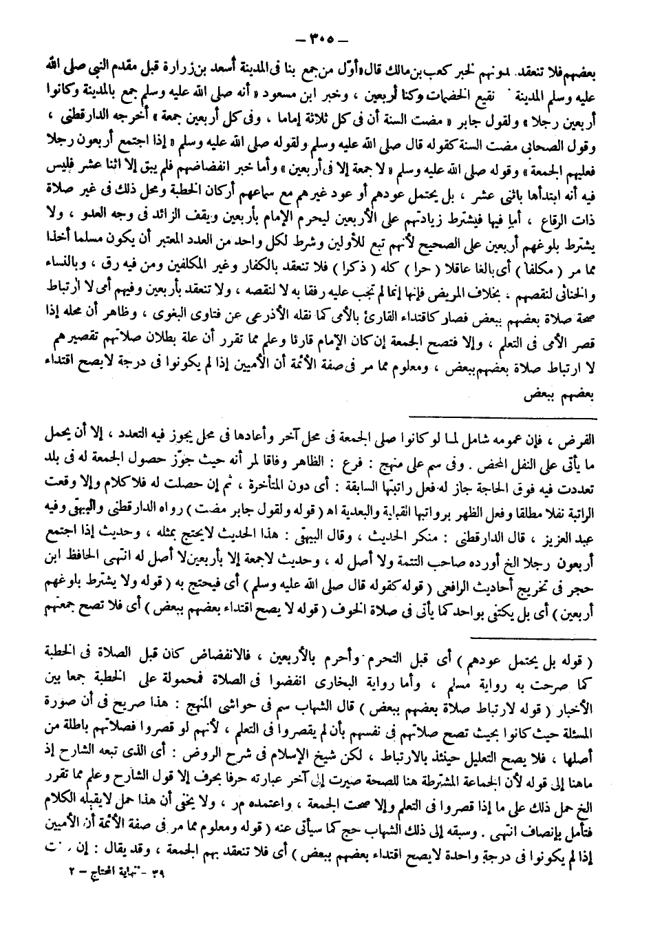 وَقَوْلُهُ - صَلَّى اللَّهُ عَلَيْهِ وَسَلَّمَ - «لَا جُمُعَةَ إلَّا فِي أَرْبَعِينَ» وَأَمَّا خَبَرُ انْفِضَاضِهِمْ فَلَمْ يَبْقَ إلَّا اثْنَا عَشَرَ فَلَيْسَ فِيهِ أَنَّهُ ابْتَدَأَهَا بِاثْنَيْ عَشَرَ، بَلْ يُحْتَمَلُ عَوْدُهُمْ أَوْ عَوْدُ غَيْرِهِمْ مَعَ سَمَاعِهِمْ أَرْكَانَ الْخُطْبَةِ وَمَحَلُّ ذَلِكَ فِي غَيْرِ صَلَاةِ ذَاتِ الرِّقَاعِ، أَمَّا فِيهَا فَيُشْتَرَطُ زِيَادَتُهُمْ عَلَى الْأَرْبَعِينَ لِيُحْرِمَ الْإِمَامُ بِأَرْبَعِينَ وَيَقِفَ الزَّائِدُ فِي وَجْهِ الْعَدُوِّ، وَلَا يُشْتَرَطُ بُلُوغُهُمْ أَرْبَعِينَ عَلَى الصَّحِيحِ لِأَنَّهُمْ تَبَعٌ لِلْأَوَّلَيْنِ وَشَرْطٌ لِكُلِّ وَاحِدٍ مِنْ الْعَدَدِ الْمُعْتَبَرِ أَنْ يَكُونَ مُسْلِمًا أَخْذًا مِمَّا مَرَّ (مُكَلَّفًا) أَيْ بَالِغًا عَاقِلًا (حُرًّا) كُلَّهُ (ذَكَرًا) فَلَا تَنْعَقِدُ بِالْكُفَّارِ وَغَيْرِ الْمُكَلَّفِينَ وَمَنْ فِيهِ رِقٌّ، وَبِالنِّسَاءِ وَالْخَنَاثَى لِنَقْصِهِمْ، بِخِلَافِ الْمَرِيضِ فَإِنَّهَا إنَّمَا لَمْ تَجِبُ عَلَيْهِ رِفْقًا بِهِ لَا لِنَقْصِهِ، وَلَا تَنْعَقِدُ بِأَرْبَعِينَ وَفِيهِمْ أُمِّيٌّ لِارْتِبَاطِ صِحَّةِ صَلَاةِ بَعْضِهِمْ بِبَعْضٍ فَصَارَ كَاقْتِدَاءِ الْقَارِئِ بِالْأُمِّيِّ كَمَا نَقَلَهُ الْأَذْرَعِيُّ عَنْ فَتَاوَى الْبَغَوِيّ، وَظَاهِرٌ أَنَّ مَحَلَّهُ إذَا قَصَّرَ الْأُمِّيُّ فِي التَّعَلُّمِ، وَإِلَّا فَتَصِحُّ الْجُمُعَةُ إنْ كَانَ الْإِمَامُ قَارِئًا وَعُلِمَ مِمَّا تَقَرَّرَ أَنَّ عِلَّةَ بُطْلَانِ صَلَاتِهِمْ تَقْصِيرُهُمْ لَا ارْتِبَاطُ صَلَاةِ بَعْضِهِمْ بِبَعْضٍ، وَمَعْلُومٌ مِمَّا مَرَّ فِي صِفَةِ الْأَئِمَّةِ أَنَّ الْأُمِّيِّينَ إذَا لَمْ يَكُونُوا فِي دَرَجَةٍ لَا يَصِحُّ اقْتِدَاءُ بَعْضِهِمْ بِبَعْضٍ