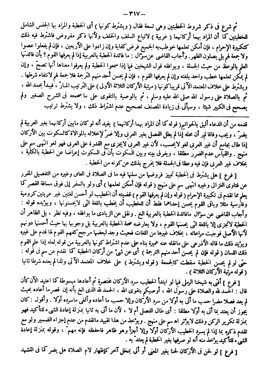 ثُمَّ شَرَعَ فِي ذِكْرِ شُرُوطِ الْخُطْبَتَيْنِ وَهِيَ تِسْعَةٌ فَقَالَ (وَيُشْتَرَطُ كَوْنُهَا) أَيْ الْخُطْبَةُ وَالْمُرَادُ بِهَا الْجِنْسُ الشَّامِلُ لِلْخُطْبَتَيْنِ كَمَا أَنَّ الْمُرَادَ بِهِمَا أَرْكَانُهُمَا (عَرَبِيَّةً) لِاتِّبَاعِ السَّلَفِ وَالْخَلَفِ وَلِأَنَّهَا ذِكْرٌ مَفْرُوضٌ فَاشْتُرِطَ فِيهِ ذَلِكَ كَتَكْبِيرَةِ الْإِحْرَامِ، فَإِنْ أَمْكَنَ تَعَلُّمُهَا خُوطِبَ بِهِ الْجَمِيعُ فَرْضَ كِفَايَةٍ وَإِنْ زَادُوا عَلَى الْأَرْبَعِينَ، فَإِنْ لَمْ يَفْعَلُوا عَصَوْا وَلَا جُمُعَةَ لَهُمْ بَلْ يُصَلُّونَ الظُّهْرَ. وَأَجَابَ الْقَاضِي عَنْ سُؤَالِ: مَا فَائِدَةُ الْخُطْبَةِ بِالْعَرَبِيَّةِ إذَا لَمْ يَعْرِفْهَا الْقَوْمُ؟ بِأَنَّ فَائِدَتَهَا الْعِلْمُ بِالْوَعْظِ مِنْ حَيْثُ الْجُمْلَةِ، وَيُوَافِقُهُ قَوْلُ الشَّيْخَيْنِ فِيمَا إذَا سَمِعُوا الْخُطْبَةَ وَلَمْ يَعْرِفُوا مَعْنَاهَا أَنَّهَا تَصِحُّ، وَإِنْ لَمْ يُمْكِنْ تَعَلُّمُهَا خَطَبَ وَاحِدٌ بِلُغَتِهِ وَإِنْ لَمْ يَعْرِفْهَا الْقَوْمُ، فَإِنْ لَمْ يُحْسِنْ أَحَدٌ مِنْهُمْ التَّرْجَمَةَ فَلَا جُمُعَةَ لَهُمْ لِانْتِفَاءِ شَرْطِهَا. وَيُشْتَرَطُ عَلَى خِلَافِ الْمُعْتَمَدِ الْآتِي قَرِيبًا كَوْنُهَا (مُرَتَّبَةَ الْأَرْكَانِ الثَّلَاثَةِ الْأُولَى) عَلَى التَّرْتِيبِ الْمَارِّ، فَيَبْدَأُ بِحَمْدِ اللَّهِ، ثُمَّ بِالصَّلَاةِ عَلَى رَسُولِ اللَّهِ - صَلَّى اللَّهُ عَلَيْهِ وَسَلَّمَ -، ثُمَّ بِالْوَصِيَّةِ بِالتَّقْوَى عَلَى مَا صَحَّحَهُ فِي الشَّرْحِ الصَّغِيرِ وَلَمْ يُصَحِّحْ فِي الْكَبِيرِ شَيْئًا، وَسَيَأْتِي فِي زِيَادَةِ الْمُصَنِّفِ تَصْحِيحُ عَدَمِ اشْتِرَاطِ ذَلِكَ، وَلَا يُشْتَرَطُ تَرْتِيبٌ