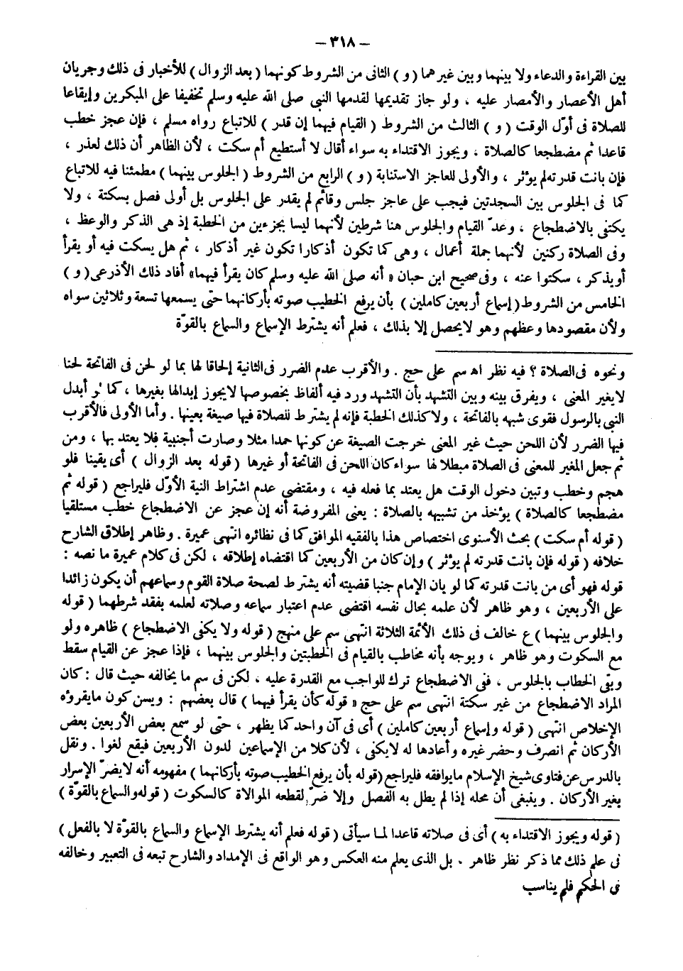 (قَوْلُهُ: ثُمَّ مُضْطَجِعًا كَالصَّلَاةِ) يُؤْخَذُ مِنْ تَشْبِيهِهِ بِالصَّلَاةِ: يَعْنِي الْمَفْرُوضَةَ أَنَّهُ إنْ عَجَزَ عَنْ الِاضْطِجَاعِ خَطَبَ مُسْتَلْقِيًا (قَوْلُهُ أَمْ سَكَتَ) بَحَثَ الْإِسْنَوِيُّ اخْتِصَاصَ هَذَا بِالْفَقِيهِ الْمُوَافِقِ كَمَا فِي نَظَائِرِهِ انْتَهَى عَمِيرَةُ. وَظَاهِرُ إطْلَاقِ الشَّارِحِ خِلَافُهُ (قَوْلُهُ: فَإِنْ بَانَتْ قُدْرَتُهُ لَمْ يُؤَثِّرْ) وَإِنْ كَانَ مِنْ الْأَرْبَعِينَ كَمَا اقْتَضَاهُ إطْلَاقُهُ، لَكِنَّ فِي كَلَامِ عَمِيرَةَ مَا نَصُّهُ: قَوْلُهُ فَهُوَ أَيْ مَنْ بَانَتْ قُدْرَتُهُ كَمَا لَوْ بَانَ الْإِمَامُ جُنُبًا قَضِيَّتُهُ أَنَّهُ يُشْتَرَطُ لِصِحَّةِ صَلَاةِ الْقَوْمِ وَسَمَاعِهِمْ أَنْ يَكُونَ زَائِدًا عَلَى الْأَرْبَعِينَ، وَهُوَ ظَاهِرٌ لِأَنَّ عِلْمَهُ بِحَالِ نَفْسِهِ اقْتَضَى عَدَمَ اعْتِبَارِ سَمَاعِهِ وَصَلَاتِهِ لِعِلْمِهِ بِفَقْدِ شَرْطِهِمَا.