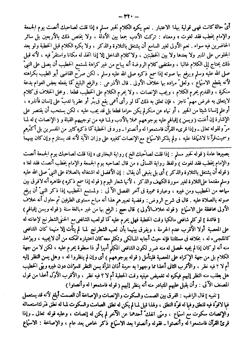أَيِّ حَالَةٍ كَانَتْ فَهِيَ قَوْلِيَّةٌ بِهَذَا الِاعْتِبَارِ. نَعَمْ يُكْرَهُ الْكَلَامُ لِخَبَرِ مُسْلِمٍ «إذَا قُلْت لِصَاحِبِك أَنْصِتْ يَوْمَ الْجُمُعَةِ وَالْإِمَامُ يَخْطُبُ فَقَدْ لَغَوْت» وَمَعْنَاهُ: تَرَكْت الْأَدَبَ جَمْعًا بَيْنَ الْأَدِلَّةِ، وَلَا يَخْتَصُّ ذَلِكَ بِالْأَرْبَعِينَ بَلْ سَائِرُ الْحَاضِرِينَ فِيهِ سَوَاءٌ.