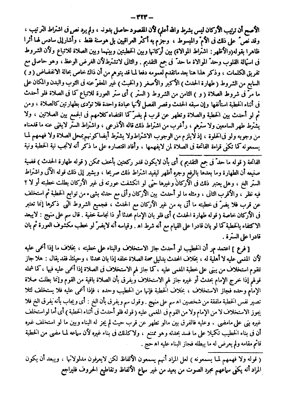 (وَ) السَّابِعُ مِنْ الشُّرُوطِ (طَهَارَةُ الْحَدَثِ) الْأَكْبَرِ وَالْأَصْغَرِ (وَالْخَبَثِ) غَيْرِ الْمَعْفُوِّ عَنْهُ فِي الثَّوْبِ وَالْبَدَنِ وَالْمَكَانِ عَلَى مَا مَرَّ فِي شُرُوطِ الصَّلَاةِ (وَ) الثَّامِنُ مِنْ الشُّرُوطِ (السَّتْرُ) أَيْ سَتْرُ الْعَوْرَةِ لِلِاتِّبَاعِ كَمَا فِي الصَّلَاةِ فَلَوْ أَحْدَثَ فِي أَثْنَاءِ الْخُطْبَةِ اسْتَأْنَفَهَا وَإِنْ سَبَقَهُ الْحَدَثُ وَقَصُرَ الْفَصْلُ لِأَنَّهَا عِبَادَةٌ وَاحِدَةٌ فَلَا تُؤَدَّى بِطَهَارَتَيْنِ كَالصَّلَاةِ، وَمِنْ ثَمَّ لَوْ أَحْدَثَ بَيْنَ الْخُطْبَةِ وَالصَّلَاةِ وَتَطَهَّرَ عَنْ قُرْبٍ لَمْ يَضُرَّ كَمَا اقْتَضَاهُ كَلَامُهُمْ فِي الْجَمْعِ بَيْنَ الصَّلَاتَيْنِ، وَلَا يُشْتَرَطُ طُهْرُ السَّامِعِينَ وَلَا سَتْرُهُمْ، وَأَغْرُبُ مِنْ اشْتِرَاطِ ذَلِكَ قَالَهُ الْأَذْرَعِيُّ، وَاشْتِرَاطُ السَّتْرِ لَا يُغْنِي عَنْهُ مَا قَدَّمْنَاهُ مِنْ وُجُوبِهِ وَلَوْ فِي الْخَلْوَةِ، إذْ لَا يَلْزَمُ مِنْ الْوُجُوبِ الِاشْتِرَاطُ وَلَا يُشْتَرَطُ أَيْضًا كَوْنُهُمْ بِمَحَلِّ الصَّلَاةِ وَلَا فَهْمُهُمْ لِمَا يَسْمَعُونَهُ كَمَا تَكْفِي قِرَاءَةُ الْفَاتِحَةِ فِي الصَّلَاةِ لِمَنْ لَا يَفْهَمُهَا، وَأَفَادَ اقْتِصَارُهُ عَلَى مَا ذُكِرَ أَنَّهُ لَا تَجِبُ نِيَّةُ الْخُطْبَةِ وَنِيَّةُ