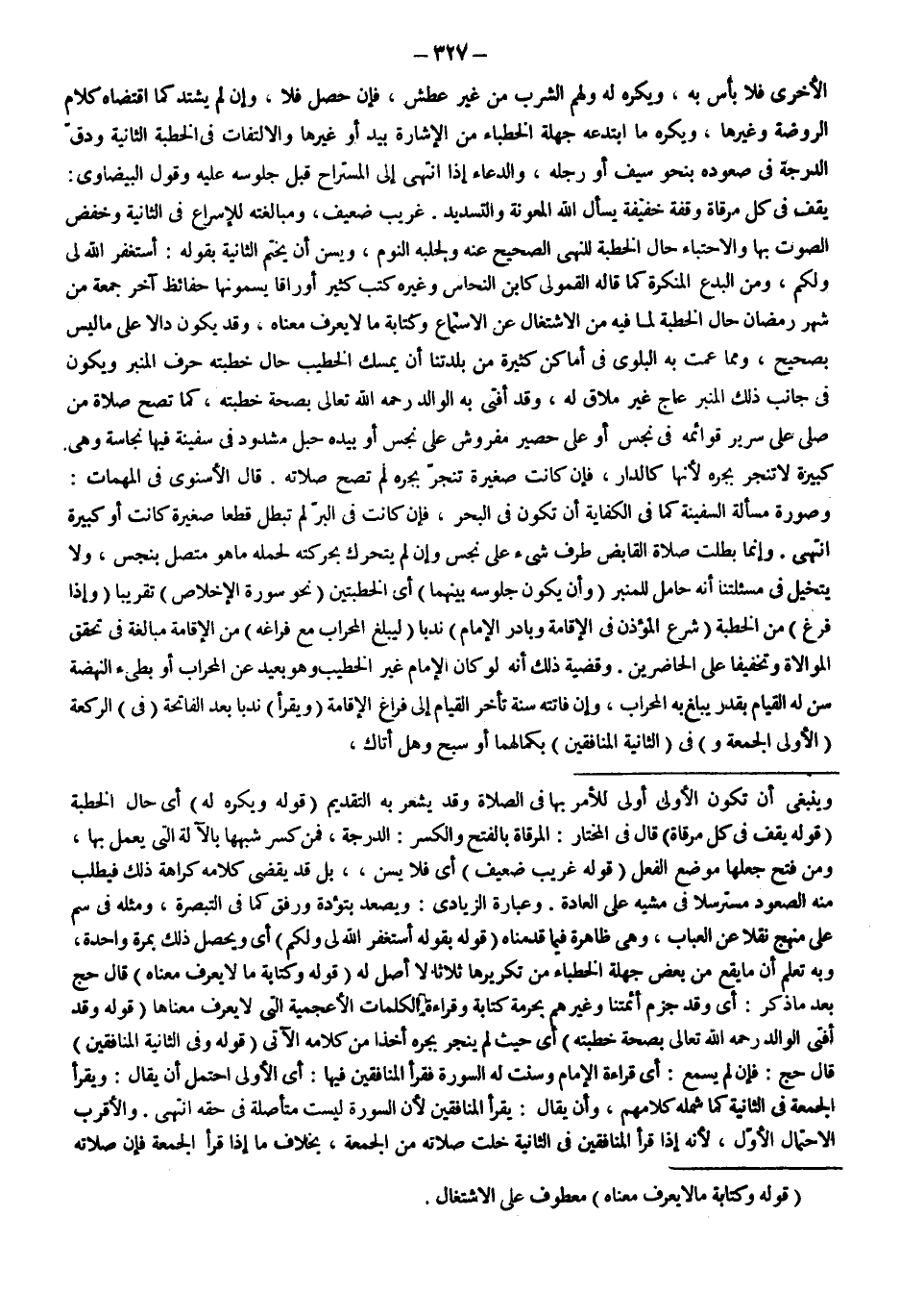 ـــــــــــــــــــــــــــــSوَيَنْبَغِي أَنْ تَكُونَ الْأُولَى أَوْلَى لِلْأَمْرِ بِهَا فِي الصَّلَاةِ وَقَدْ يُشْعِرُ بِهِ التَّقْدِيمُ (قَوْلُهُ: وَيُكْرَهُ لَهُ) أَيْ حَالَ الْخُطْبَةِ (قَوْلُهُ: يَقِفُ فِي كُلِّ مِرْقَاةٍ) قَالَ فِي الْمُخْتَارِ: الْمِرْقَاةُ بِالْفَتْحِ وَالْكَسْرِ: الدَّرَجَةُ، فَمَنْ كَسَرَ شَبَّهَهَا بِالْآلَةِ الَّتِي يَعْمَلُ بِهَا، وَمَنْ فَتَحَ جَعَلَهَا مَوْضِعَ الْفِعْلِ (قَوْلُهُ: غَرِيبٌ ضَعِيفٌ) أَيْ فَلَا يُسَنُّ، بَلْ قَدْ يَقْضِي كَلَامُهُ كَرَاهَةَ ذَلِكَ فَيُطْلَبُ مِنْهُ الصُّعُودُ مُسْتَرْسِلًا فِي مَشْيِهِ عَلَى الْعَادَةِ. وَعِبَارَةُ الزِّيَادِيِّ: وَيَصْعَدُ بِتُؤَدَةٍ وَرِفْقٍ كَمَا فِي التَّبْصِرَةِ، وَمِثْلُهُ فِي سم عَلَى مَنْهَجٍ نَقْلًا عَنْ الْعُبَابِ، وَهِيَ ظَاهِرَةٌ فِيمَا قَدَّمْنَاهُ (قَوْلُهُ: بِقَوْلِهِ أَسْتَغْفِرُ اللَّهَ لِي وَلَكُمْ) أَيْ وَيَحْصُلُ ذَلِكَ بِمَرَّةٍ وَاحِدَةٍ، وَبِهِ تَعْلَمُ أَنَّ مَا يَقَعُ مِنْ بَعْضِ جَهَلَةِ الْخُطَبَاءِ مِنْ تَكْرِيرِهَا ثَلَاثًا لَا أَصْلَ لَهُ (قَوْلُهُ: وَكِتَابَةُ مَا لَا يُعْرَفُ مَعْنَاهُ) قَالَ حَجّ بَعْدَ مَا ذَكَرَ: أَيْ وَقَدْ جَزَمَ أَئِمَّتُنَا وَغَيْرُهُمْ بِحُرْمَةِ كِتَابَةِ وَقِرَاءَةِ الْكَلِمَاتِ الْأَعْجَمِيَّةِ الَّتِي لَا يُعْرَفُ مَعْنَاهَا (قَوْلُهُ: وَقَدْ أَفْتَى الْوَالِدُ - رَحِمَهُ اللَّهُ تَعَالَى - بِصِحَّةِ خُطْبَتِهِ) أَيْ حَيْثُ لَمْ يَنْجَرَّ بِجَرِّهِ أَخْذًا مِنْ كَلَامِهِ الْآتِي.
