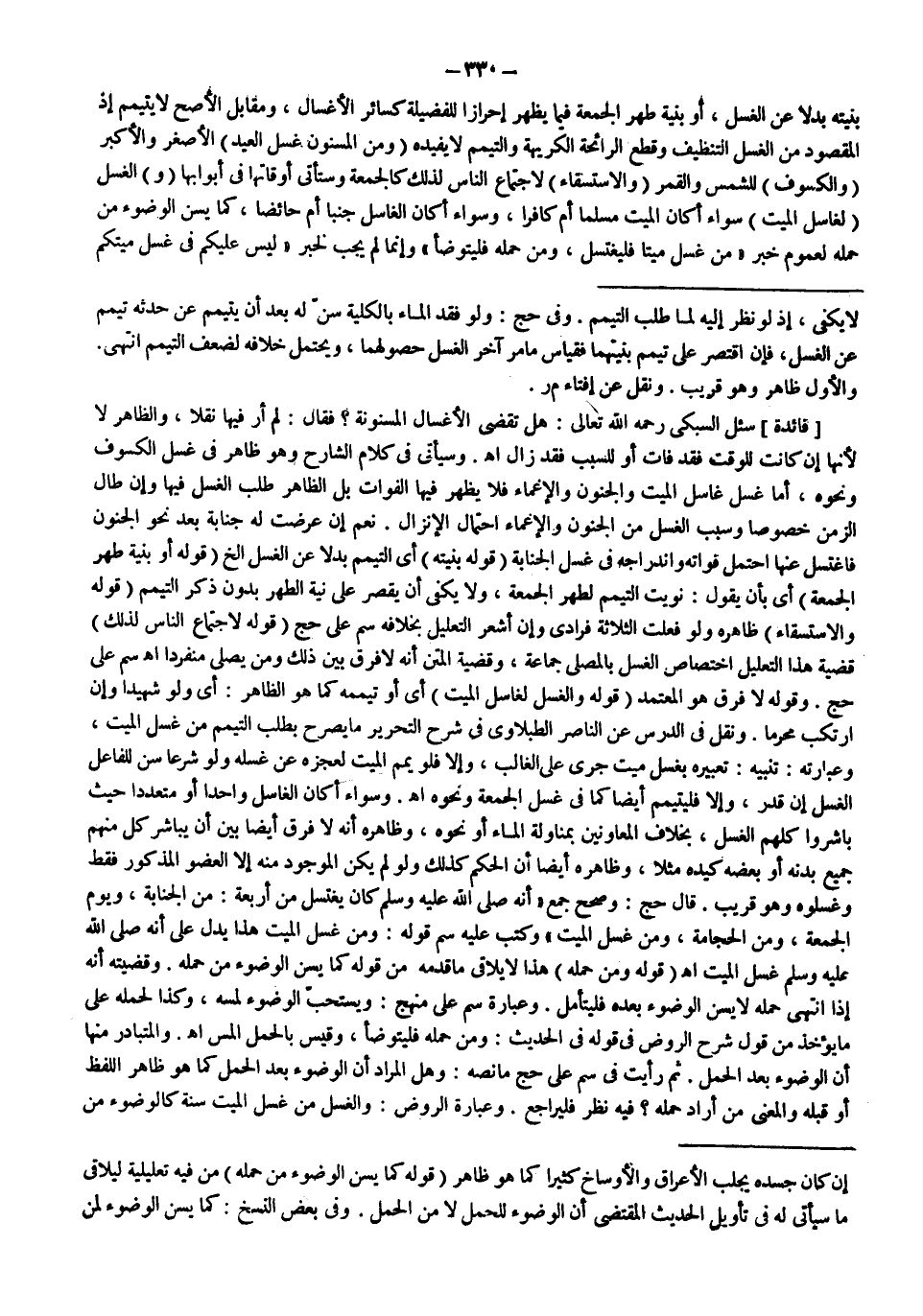[فَائِدَةٌ] سُئِلَ السُّبْكِيُّ - رَحِمَهُ اللَّهُ تَعَالَى -: هَلْ تُقْضَى الْأَغْسَالُ الْمَسْنُونَةُ؟ فَقَالَ: لَمْ أَرَ فِيهَا نَقْلًا، وَالظَّاهِرُ لَا لِأَنَّهَا إنْ كَانَتْ لِلْوَقْتِ فَقَدْ فَاتَ أَوْ لِلسَّبَبِ فَقَدْ زَالَ اهـ. وَسَيَأْتِي فِي كَلَامِ الشَّارِحِ وَهُوَ ظَاهِرٌ فِي غُسْلِ الْكُسُوفِ وَنَحْوِهِ، أَمَّا غُسْلُ غَاسِلِ الْمَيِّتِ وَالْجُنُونِ وَالْإِغْمَاءِ فَلَا يَظْهَرُ فِيهَا الْفَوَاتُ بَلْ الظَّاهِرُ طَلَبُ الْغُسْلِ فِيهَا وَإِنْ طَالَ الزَّمَنُ خُصُوصًا وَسَبَبُ الْغُسْلِ مِنْ الْجُنُونِ وَالْإِغْمَاءِ احْتِمَالُ الْإِنْزَالِ. نَعَمْ إنْ عَرَضَتْ لَهُ جَنَابَةٌ بَعْدَ نَحْوِ الْجُنُونِ فَاغْتَسَلَ عَنْهَا احْتَمَلَ فَوَاتُهُ وَانْدِرَاجُهُ فِي غُسْلِ الْجَنَابَةِ (قَوْلُهُ بِنِيَّتِهِ) أَيْ التَّيَمُّمِ بَدَلًا عَنْ الْغُسْلِ إلَخْ (قَوْلُهُ أَوْ بِنِيَّةِ طُهْرِ الْجُمُعَةِ) أَيْ بِأَنْ يَقُولَ: نَوَيْت التَّيَمُّمَ لِطُهْرِ الْجُمُعَةِ، وَلَا يَكْفِي أَنْ يَقْصِرَ عَلَى نِيَّةِ الطُّهْرِ بِدُونِ ذِكْرِ التَّيَمُّمِ.