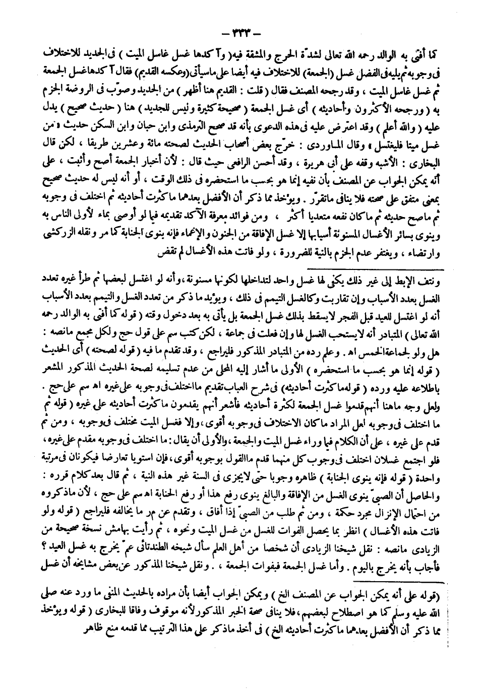كَمَا أَفْتَى بِهِ الْوَالِدُ - رَحِمَهُ اللَّهُ تَعَالَى - لِشِدَّةِ الْحَرَجِ وَالْمَشَقَّةِ فِيهِ (وَآكَدُهَا غُسْلُ غَاسِلِ الْمَيِّتِ) فِي الْجَدِيدِ لِلِاخْتِلَافِ فِي وُجُوبِهِ ثُمَّ يَلِيه فِي الْفَضْلِ غُسْلُ (الْجُمُعَةِ) لِلِاخْتِلَافِ فِيهِ أَيْضًا عَلَى مَا سَيَأْتِي (وَعَكْسُهُ الْقَدِيمُ) فَقَالَ آكَدُهَا غُسْلُ الْجُمُعَةِ ثُمَّ غُسْلُ غَاسِلِ الْمَيِّتِ، وَقَدْ رَجَّحَهُ الْمُصَنِّفُ فَقَالَ (قُلْت: الْقَدِيمُ هُنَا أَظْهَرُ) مِنْ الْجَدِيدِ وَصَوَّبَ فِي الرَّوْضَةِ الْجَزْمَ بِهِ (وَرَجَّحَهُ الْأَكْثَرُونَ وَأَحَادِيثُهُ) أَيْ غُسْلِ الْجُمُعَةِ (صَحِيحَةٌ كَثِيرَةٌ وَلَيْسَ لِلْجَدِيدِ) هُنَا (حَدِيثٌ صَحِيحٌ) يَدُلُّ عَلَيْهِ (وَاَللَّهُ أَعْلَمُ) وَقَدْ اعْتَرَضَ عَلَيْهِ فِي هَذِهِ الدَّعْوَى بِأَنَّهُ قَدْ صَحَّحَ التِّرْمِذِيُّ وَابْنُ حِبَّانَ وَابْنُ السَّكَنِ حَدِيثَ «مَنْ غَسَّلَ مَيِّتًا فَلْيَغْتَسِلْ» وَقَالَ الْمَاوَرْدِيُّ: خَرَّجَ بَعْضُ أَصْحَابِ الْحَدِيثِ لِصِحَّتِهِ مِائَةً وَعِشْرِينَ طَرِيقًا، لَكِنْ قَالَ الْبُخَارِيُّ: الْأَشْبَهُ وَقْفُهُ عَلَى أَبِي هُرَيْرَةَ، وَقَدْ أَحْسَنَ الرَّافِعِيُّ حَيْثُ قَالَ: لِأَنَّ أَخْبَارَ الْجُمُعَةِ أَصَحُّ وَأَثْبَتُ، عَلَى أَنَّهُ يُمْكِنُ الْجَوَابُ عَنْ الْمُصَنِّفِ بِأَنَّ نَفْيَهُ إنَّمَا هُوَ بِحَسَبِ مَا اسْتَحْضَرَهُ فِي ذَلِكَ الْوَقْتِ، أَوْ أَنَّهُ لَيْسَ لَهُ حَدِيثٌ صَحِيحٌ بِمَعْنًى مُتَّفَقٍ عَلَى صِحَّتِهِ فَلَا يُنَافِي مَا تَقَرَّرَ. وَيُؤْخَذُ مِمَّا ذُكِرَ أَنَّ الْأَفْضَلَ بَعْدَهُمَا مَا كَثُرْت أَحَادِيثُهُ ثُمَّ اُخْتُلِفَ فِي وُجُوبِهِ ثُمَّ مَا صَحَّ حَدِيثُهُ ثُمَّ مَا كَانَ نَفْعُهُ مُتَعَدِّيًا أَكْثَرَ، وَمِنْ فَوَائِدِ مَعْرِفَةِ الْآكَدِ تَقْدِيمُهُ فِيمَا لَوْ أَوْصَى بِمَاءٍ لِأَوْلَى النَّاسِ بِهِ وَيَنْوِي بِسَائِرِ الْأَغْسَالِ الْمَسْنُونَةِ أَسْبَابَهَا إلَّا غُسْلَ الْإِفَاقَةِ مِنْ الْجُنُونِ وَالْإِغْمَاءِ فَإِنَّهُ يَنْوِي الْجَنَابَةَ كَمَا مَرَّ وَنَقَلَهُ الزَّرْكَشِيُّ وَارْتَضَاهُ، وَيُغْتَفَرُ عَدَمُ الْجَزْمِ بِالنِّيَّةِ لِلضَّرُورَةِ، وَلَوْ فَاتَتْ هَذِهِ الْأَغْسَالُ لَمْ تُقْضَ.