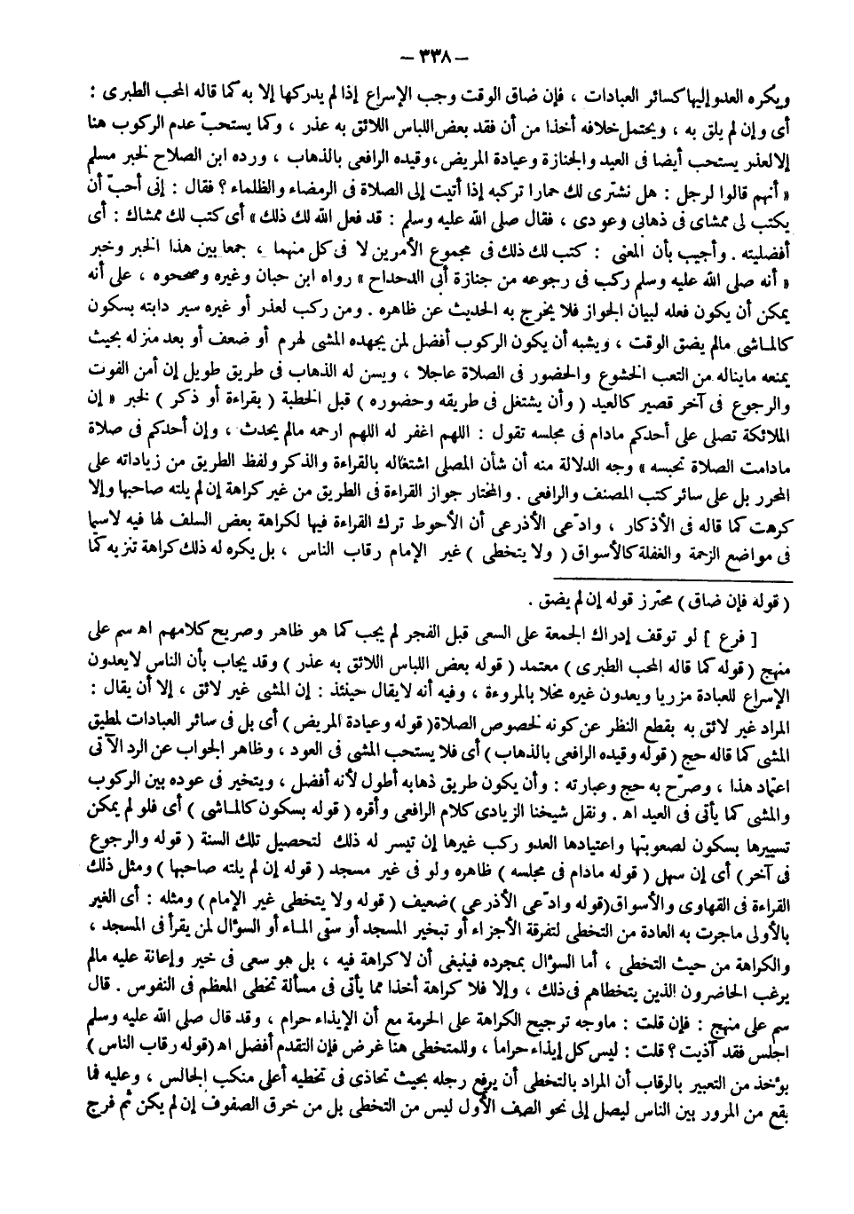[فَرْعٌ] لَوْ تَوَقَّفَ إدْرَاكُ الْجُمُعَةِ عَلَى السَّعْيِ قَبْلَ الْفَجْرِ لَمْ يَجِبْ كَمَا هُوَ ظَاهِرُ وَصَرِيحُ كَلَامِهِمْ اهـ سم عَلَى مَنْهَجٍ (قَوْلُهُ: كَمَا قَالَهُ الْمُحِبُّ الطَّبَرِيُّ) مُعْتَمَدٌ (قَوْلُهُ بَعْضِ اللِّبَاسِ اللَّائِقِ بِهِ عُذْرٌ) وَقَدْ يُجَابُ بِأَنَّ النَّاسَ لَا يَعُدُّونَ الْإِسْرَاعَ لِلْعِبَادَةِ مُزْرِيًا وَيَعُدُّونَ غَيْرَهُ مُخِلًّا بِالْمُرُوءَةِ، وَفِيهِ أَنَّهُ لَا يُقَالُ حِينَئِذٍ: إنَّ الْمَشْيَ غَيْرُ لَائِقٍ، إلَّا أَنْ يُقَالَ: الْمُرَادُ غَيْرُ لَائِقٍ بِهِ بِقَطْعِ النَّظَرِ عَنْ كَوْنِهِ لِخُصُوصِ الصَّلَاةِ (قَوْلُهُ: وَعِيَادَةُ الْمَرِيضِ) أَيْ بَلْ فِي سَائِرِ الْعِبَادَاتِ لِمُطِيقِ الْمَشْيِ كَمَا قَالَهُ حَجّ (قَوْلُهُ: وَقَيَّدَهُ الرَّافِعِيُّ بِالذَّهَابِ) أَيْ فَلَا يُسْتَحَبُّ الْمَشْيُ فِي الْعَوْدِ، وَظَاهِرُ الْجَوَابِ عَنْ الرَّدِّ الْآتِي اعْتِمَادُ هَذَا، وَصَرَّحَ بِهِ حَجّ وَعِبَارَتُهُ: وَأَنْ يَكُونَ طَرِيقُ ذَهَابِهِ أَطْوَلَ لِأَنَّهُ أَفْضَلُ، وَيَتَخَيَّرُ فِي عَوْدِهِ بَيْنَ الرُّكُوبِ وَالْمَشْيِ كَمَا يَأْتِي فِي الْعِيدِ اهـ. وَنَقَلَ شَيْخُنَا الزِّيَادِيُّ كَلَامَ الرَّافِعِيِّ وَأَقَرَّهُ (قَوْلُهُ: بِسُكُونٍ كَالْمَاشِي) أَيْ فَلَوْ لَمْ يُمْكِنْ تَسْيِيرُهَا بِسُكُونٍ لِصُعُوبَتِهَا وَاعْتِيَادِهَا الْعَدْوَ رَكِبَ غَيْرَهَا إنْ تَيَسَّرَ لَهُ ذَلِكَ لِتَحْصِيلِ تِلْكَ السُّنَّةِ.