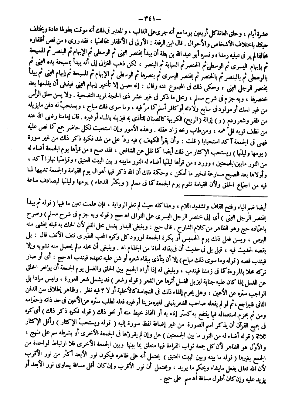 (قُلْت: وَأَنْ يَقْرَأَ الْكَهْفَ) فِيهِ رَدٌّ عَلَى مَنْ شَذَّ فَكَرِهَ ذِكْرَ ذَلِكَ مِنْ غَيْرِ سُورَةٍ (يَوْمَهَا وَلَيْلَتَهَا) وَيُسْتَحَبُّ الْإِكْثَارُ مِنْ ذَلِكَ أَيْضًا كَمَا نُقِلَ عَنْ الشَّافِعِيِّ، فَقَدْ صَحَّ «مَنْ قَرَأَهَا يَوْمَ الْجُمُعَةِ أَضَاءَ لَهُ مِنْ النُّورِ مَا بَيْنَ الْجُمُعَتَيْنِ» وَوَرَدَ «مَنْ قَرَأَهَا لَيْلَتَهَا أَضَاءَ لَهُ مِنْ النُّورِ مَا بَيْنَهُ وَبَيْنَ الْبَيْتِ الْعَتِيقِ» وَقِرَاءَتُهَا نَهَارًا آكَدُ، وَأَوْلَاهَا بَعْدَ الصُّبْحِ مُسَارَعَةً لِلْخَيْرِ مَا أَمْكَنَ، وَحِكْمَةُ ذَلِكَ أَنَّ اللَّهَ ذَكَرَ فِيهَا أَهْوَالَ يَوْمِ الْقِيَامَةِ، وَالْجُمُعَةُ تُشْبِهُهَا لِمَا فِيهِ مِنْ اجْتِمَاعِ الْخَلْقِ وَلِأَنَّ الْقِيَامَةَ تَقُومُ يَوْمَ الْجُمُعَةِ كَمَا فِي مُسْلِمٍ (وَيُكْثِرُ الدُّعَاءَ) يَوْمَهَا وَلَيْلَتَهَا لِيُصَادِفَ سَاعَةَ