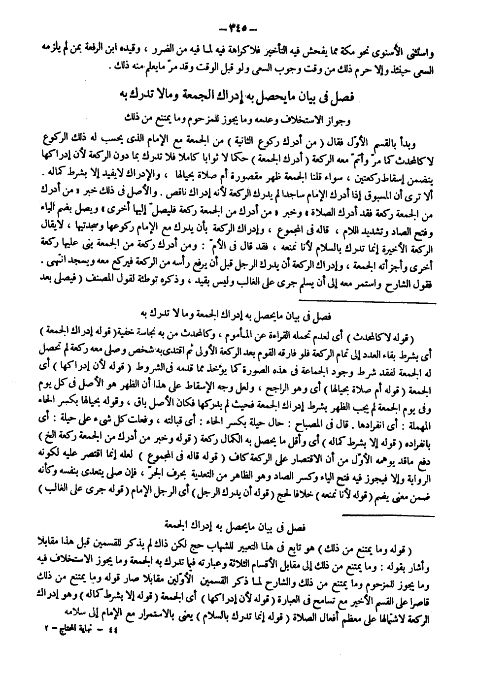 فَصْلٌ فِي بَيَانِ مَا يَحْصُلُ بِهِ إدْرَاكُ الْجُمُعَةِ وَمَا لَا تُدْرَكُ بِهِ وَجَوَازِ الِاسْتِخْلَافِ وَعَدَمِهِ وَمَا يَجُوزُ لِلْمَزْحُومِ وَمَا يَمْتَنِعُ مِنْ ذَلِكَ وَبَدَأَ بِالْقِسْمِ الْأَوَّلِ فَقَالَ (مَنْ) (أَدْرَكَ رُكُوعَ الثَّانِيَةِ) مِنْ الْجُمُعَةِ مَعَ الْإِمَامِ الَّذِي يُحْسَبُ لَهُ ذَلِكَ الرُّكُوعُ لَا كَالْمُحْدِثِ كَمَا مَرَّ وَأَتَمَّ مَعَهُ الرَّكْعَةَ (أَدْرَكَ الْجُمُعَةَ) حُكْمًا لَا ثَوَابًا كَامِلًا فَلَا تُدْرَكُ بِمَا دُونَ الرَّكْعَةِ لِأَنَّ إدْرَاكَهَا يَتَضَمَّنُ إسْقَاطَ رَكْعَتَيْنِ، سَوَاءٌ قُلْنَا الْجُمُعَةُ ظُهْرٌ مَقْصُورَةٌ أَمْ صَلَاةٌ بِحِيَالِهَا، وَالْإِدْرَاكُ لَا يُفِيدُ إلَّا بِشَرْطِ كَمَالِهِ.