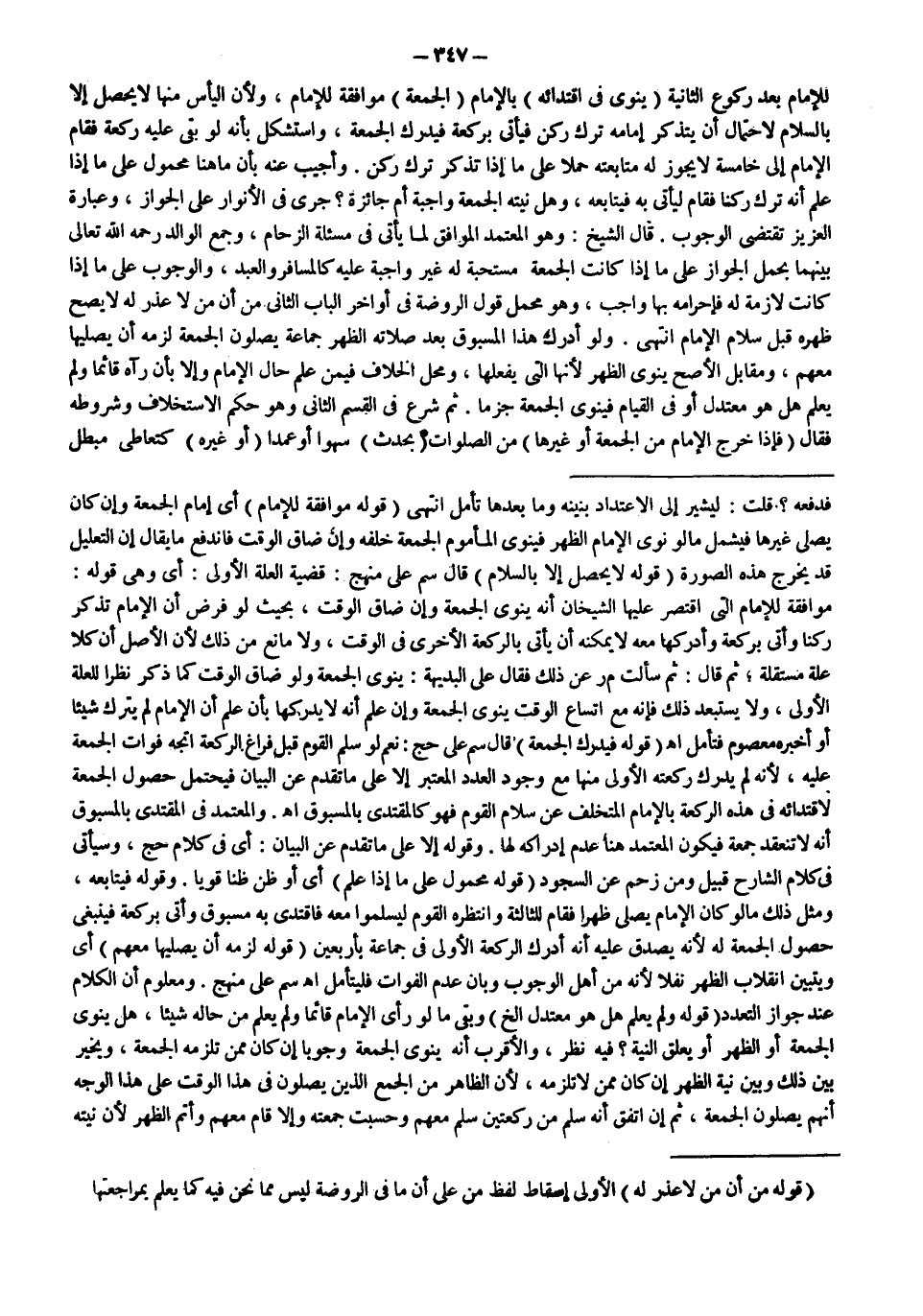 رُكْنًا وَأَتَى بِرَكْعَةٍ وَأَدْرَكَهَا مَعَهُ لَا يُمْكِنُهُ أَنْ يَأْتِيَ بِالرَّكْعَةِ الْأُخْرَى فِي الْوَقْتِ، وَلَا مَانِعَ مِنْ ذَلِكَ؛ لِأَنَّ الْأَصْلَ أَنَّ كُلًّا عِلَّةٌ مُسْتَقِلَّةٌ؛ ثُمَّ قَالَ: ثُمَّ سَأَلْت م ر عَنْ ذَلِكَ فَقَالَ عَلَى الْبَدِيهَةِ: يَنْوِي الْجُمُعَةَ وَلَوْ ضَاقَ الْوَقْتُ كَمَا ذُكِرَ نَظَرًا لِلْعِلَّةِ الْأُولَى، وَلَا يُسْتَبْعَدُ ذَلِكَ فَإِنَّهُ مَعَ اتِّسَاعِ الْوَقْتِ يَنْوِي الْجُمُعَةَ وَإِنْ عَلِمَ أَنَّهُ لَا يُدْرِكُهَا بِأَنْ عَلِمَ أَنَّ الْإِمَامَ لَمْ يَتْرُكْ شَيْئًا أَوْ أَخْبَرَهُ مَعْصُومٌ فَتَأَمَّلْ اهـ.