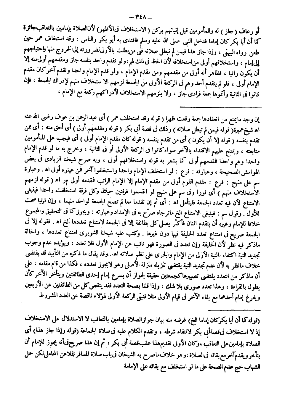 قَوْلُهُ: كَمَا أَنَّ أَبَا بَكْرٍ كَانَ إمَامًا إلَخْ) غَرَضُهُ مِنْهُ بَيَانُ جَوَازِ الصَّلَاةِ بِإِمَامَيْنِ بِالتَّعَاقُبِ لَا الِاسْتِدْلَالِ عَلَى الِاسْتِخْلَافِ إذْ لَا اسْتِخْلَافَ فِي قِصَّةِ أَبِي بَكْرٍ لِانْتِفَاءِ شَرْطِهِ، وَتَقَدَّمَ الْكَلَامُ عَلَيْهِ فِي صَلَاةِ الْجَمَاعَةِ (قَوْلُهُ: وَإِذَا جَازَ هَذَا) أَيْ الصَّلَاةُ بِإِمَامَيْنِ عَلَى التَّعَاقُبِ، وَكَانَ الْأَوْلَى تَقْدِيمَ هَذَا عَقِبَ قِصَّةِ أَبِي بَكْرٍ، ثُمَّ إنَّ هَذَا صَرِيحٌ فِي أَنَّهُ يَجُوزُ لِلْإِمَامِ أَنْ يَتَأَخَّرَ وَيُقَدِّمَ آخَرَ مَعَ بَقَائِهِ فِي الصَّلَاةِ، وَهُوَ خِلَافُ مَا صَرَّحَ بِهِ الشَّيْخَانِ فِي بَابِ صَلَاةِ الْمُسَافِرِ نَقْلًا عَنْ الْمَحَامِلِيِّ لَكِنَّ مَحَلِّ الشِّهَابِ حَجّ عَدَمُ الصِّحَّةِ عَلَى مَا لَوْ اسْتَخْلَفَ مَعَ بَقَائِهِ عَلَى الْإِمَامَةِ.