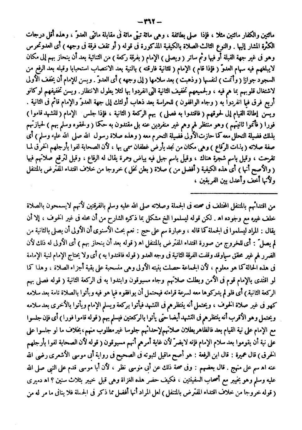 وَيُسَنُّ إطَالَةُ الْقِيَامِ إلَى لُحُوقِهِمْ (فَاقْتَدُوا بِهِ فَصَلَّى) بِهِمْ الرَّكْعَةَ (الثَّانِيَةَ، فَإِذَا جَلَسَ) الْإِمَامُ (لِلتَّشَهُّدِ قَامُوا) فَوْرًا (فَأَتَمُّوا ثَانِيَتَهُمْ) وَهُوَ مُنْتَظِرٌ لَهُمْ وَهُمْ غَيْرُ مُنْفَرِدِينَ عَنْهُ بَلْ مُقْتَدُونَ بِهِ حُكْمًا (وَلَحِقُوهُ وَسَلَّمَ بِهِمْ) لِحِيَازَتِهِمْ بِذَلِكَ فَضِيلَةَ التَّحَلُّلِ مَعَهُ كَمَا حَازَتْ الْأُولَى فَضِيلَةَ التَّحَرُّمِ مَعَهُ (وَهَذِهِ) (صَلَاةُ رَسُولِ اللَّهِ - صَلَّى اللَّهُ عَلَيْهِ وَسَلَّمَ -) أَيْ صِفَةُ صَلَاتِهِ (بِذَاتِ الرِّقَاعِ) وَهِيَ مَكَانٌ مِنْ نَجْدٍ بِأَرْضِ غَطَفَانَ سُمِّيَ بِهَا، لِأَنَّ الصَّحَابَةَ لَفُّوا بِأَرْجُلِهِمْ الْخِرَقَ لَمَّا تَقَرَّحَتْ، وَقِيلَ بِاسْمِ شَجَرَةٍ هُنَاكَ، وَقِيلَ بِاسْمِ جَبَلٍ فِيهِ بَيَاضٌ وَحُمْرَةٌ يُقَالُ لَهُ الرِّقَاعُ، وَقِيلَ لِتَرَقُّعِ صَلَاتِهِمْ فِيهَا (وَالْأَصَحُّ أَنَّهَا) أَيْ هَذِهِ الْكَيْفِيَّةَ (أَفْضَلُ مِنْ) صَلَاةِ (بَطْنِ نَخْلٍ) خُرُوجًا مِنْ خِلَافِ اقْتِدَاءِ الْمُفْتَرِضِ بِالْمُتَنَفِّلِ؛ وَلِأَنَّهَا أَخَفُّ وَأَعْدَلُ بَيْنَ الْفَرِيقَيْنِ،