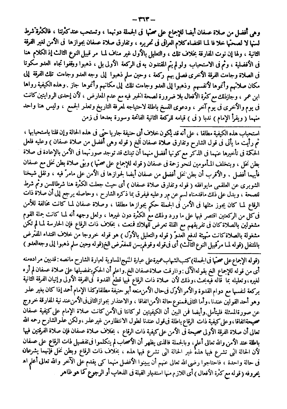 وَاعْلَمْ أَنَّ الْحُكْمَ بِتَفْصِيلِهَا عَلَى صَلَاةِ عُسْفَانَ لَمْ أَرَهُ لِغَيْرِهِ، وَتَعْلِيلُهُ بِمَا قَالَهُ فِيهِ بَحْثٌ، وَذَلِكَ؛ لِأَنَّ صَلَاةَ ذَاتِ الرِّقَاعِ فِيهَا قَطْعُ الْقُدْوَةِ فِي الْفِرْقَةِ الْأُولَى وَإِتْيَانُ الْفِرْقَةِ الثَّانِيَةِ بِرَكْعَةٍ لِنَفْسِهَا مَعَ دَوَامِ الْقُدْوَةِ وَالْأَمْرُ الْأَوَّلُ فِي حَالِ الْأَمْنِ مَنَعَهُ أَبُو حَنِيفَةَ مُطْلَقًا وَكَذَا الْإِمَامُ أَحْمَدُ إذَا كَانَ بِغَيْرِ عُذْرٍ وَهُوَ أَحَدُ الْقَوْلَيْنِ عِنْدَنَا، وَأَمَّا الثَّانِي فَمَمْنُوعٌ حَالَةَ الْأَمْنِ اتِّفَاقًا، وَالِاعْتِذَارُ بِجَوَازِ الثَّانِي فِي الْأَمْنِ عِنْدَ نِيَّةِ الْمُفَارَقَةِ خُرُوجٌ عَنْ صُورَةِ الْمَسْأَلَةِ فَلْيُتَأَمَّلْ.