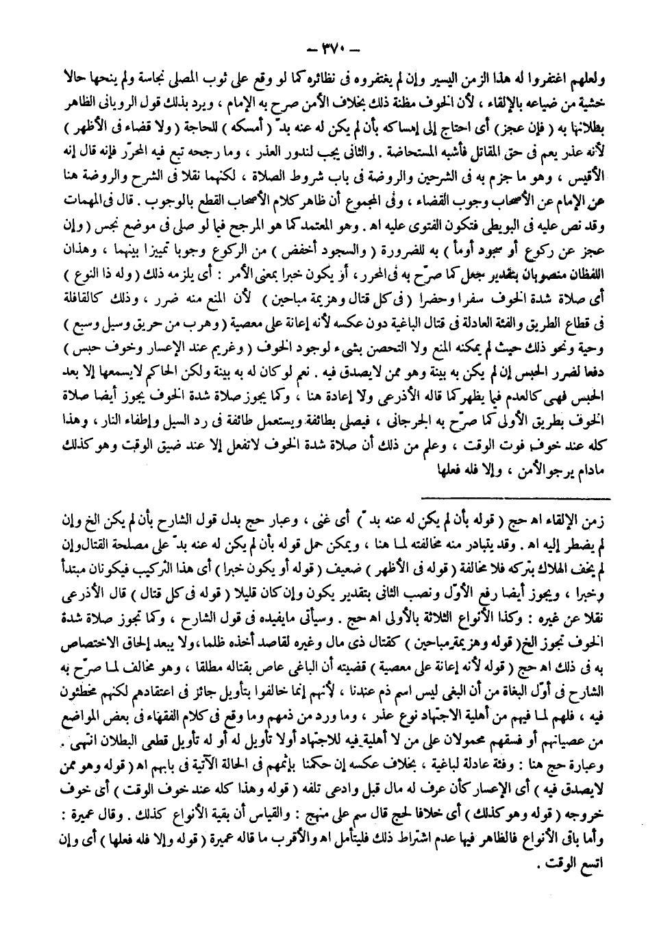 وَلَعَلَّهُمْ اغْتَفَرُوا لَهُ هَذَا الزَّمَنَ الْيَسِيرَ وَإِنْ لَمْ يَغْتَفِرُوهُ فِي نَظَائِرِهِ كَمَا لَوْ وَقَعَ عَلَى ثَوْبِ الْمُصَلِّي نَجَاسَةٌ وَلَمْ يُنَحِّهَا حَالًا خَشْيَةً مِنْ ضَيَاعِهِ بِالْإِلْقَاءِ؛ لِأَنَّ الْخَوْفَ مَظِنَّةُ ذَلِكَ بِخِلَافِ الْأَمْنِ صَرَّحَ بِهِ الْإِمَامُ، وَيُرَدُّ بِذَلِكَ قَوْلِ الرُّويَانِيِّ الظَّاهِرُ بُطْلَانُهَا بِهِ (فَإِنْ عَجَزَ) أَيْ احْتَاجَ إلَى إمْسَاكِهِ بِأَنْ لَمْ يَكُنْ لَهُ عَنْهُ بُدٌّ (أَمْسَكَهُ) لِلْحَاجَةِ (وَلَا قَضَاءَ فِي الْأَظْهَرِ) ؛ لِأَنَّهُ عُذْرٌ يَعُمُّ فِي حَقِّ الْمُقَاتِلِ فَأَشْبَهَ الْمُسْتَحَاضَةَ.