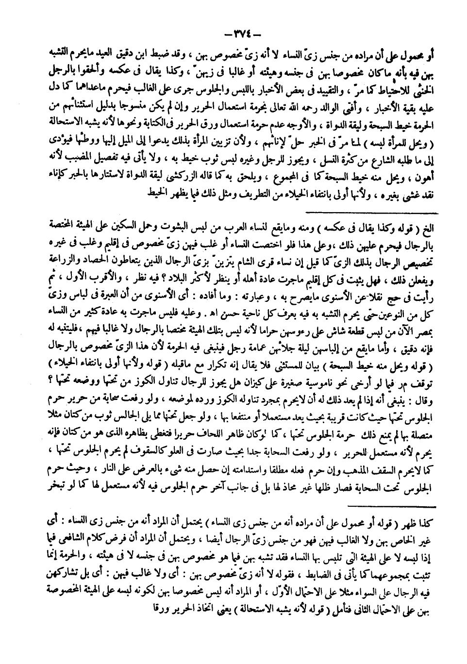 وَعَلَيْهِ فَلَيْسَ مَا جَرَتْ بِهِ عَادَةُ كَثِيرٍ مِنْ النِّسَاءِ بِمِصْرَ الْآنَ مِنْ لُبْسِ قِطْعَةِ شَاشٍ عَلَى رُءُوسِهِنَّ حَرَامًا؛ لِأَنَّهُ لَيْسَ بِتِلْكَ الْهَيْئَةِ مُخْتَصًّا بِالرِّجَالِ وَلَا غَالِبًا فِيهِمْ، فَلْيُتَنَبَّهْ لَهُ فَإِنَّهُ دَقِيقٌ، وَأَمَّا مَا يَقَعُ مِنْ إلْبَاسِهِنَّ لَيْلَةَ جَلَائِهِنَّ عِمَامَةَ رَجُلٍ فَيَنْبَغِي فِيهِ الْحُرْمَةُ؛ لِأَنَّ هَذَا الزِّيَّ مَخْصُوصٌ بِالرِّجَالِ (قَوْلُهُ: وَيَحِلُّ مِنْهُ خَيْطُ السُّبْحَةِ) بَيَانٌ لِلْمُسْتَثْنَى فَلَا يُقَالُ إنَّهُ تَكْرَارٌ مَعَ مَا قَبْلَهُ (قَوْلُهُ: وَلِأَنَّهَا أَوْلَى بِانْتِفَاءِ الْخُيَلَاءِ) تَوَقَّفَ م ر فِيمَا لَوْ أَرْخَى نَحْوَ نَامُوسِيَّةٍ صَغِيرَةٍ عَلَى كِيزَانٍ هَلْ يَجُوزُ لِلرِّجَالِ تَنَاوُلُ الْكُوزَ مِنْ تَحْتِهَا وَوَضْعُهُ تَحْتَهَا؟ وَقَالَ: يَنْبَغِي أَنَّهُ إذَا لَمْ يُعِدْ ذَلِكَ لَهُ أَنْ لَا يَحْرُمَ بِمُجَرَّدِ تَنَاوُلِهِ الْكُوزَ وَرَدِّهِ لِمَوْضِعِهِ.