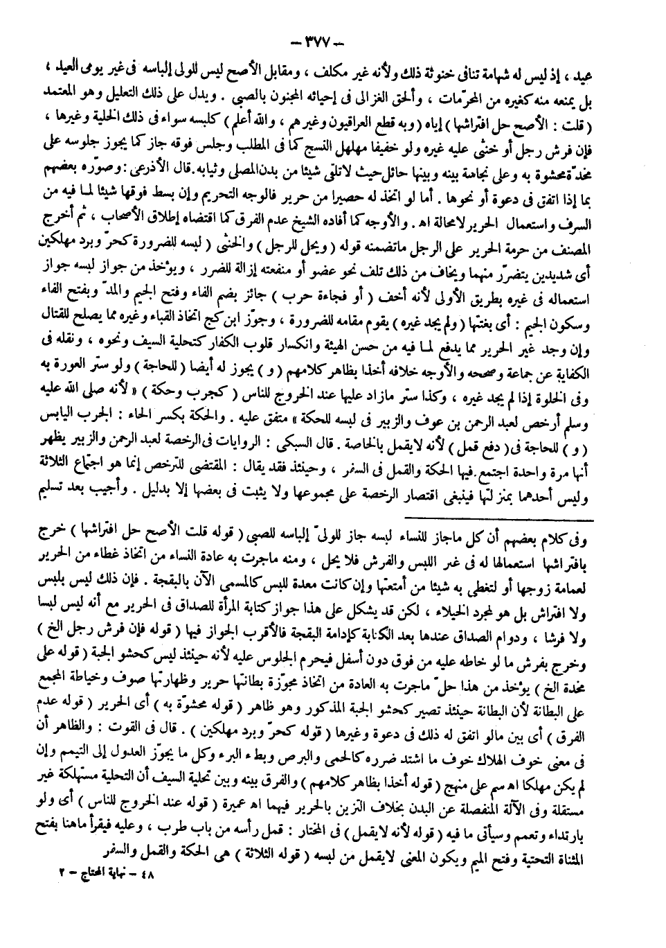 وَالْأَوْجَهُ كَمَا أَفَادَهُ الشَّيْخُ عَدَمُ الْفَرْقِ كَمَا اقْتَضَاهُ إطْلَاقُ الْأَصْحَابِ، ثُمَّ أَخْرَجَ الْمُصَنِّفُ مِنْ حُرْمَةِ الْحَرِيرِ عَلَى الرَّجُلِ مَا تَضَمَّنَهُ قَوْلُهُ