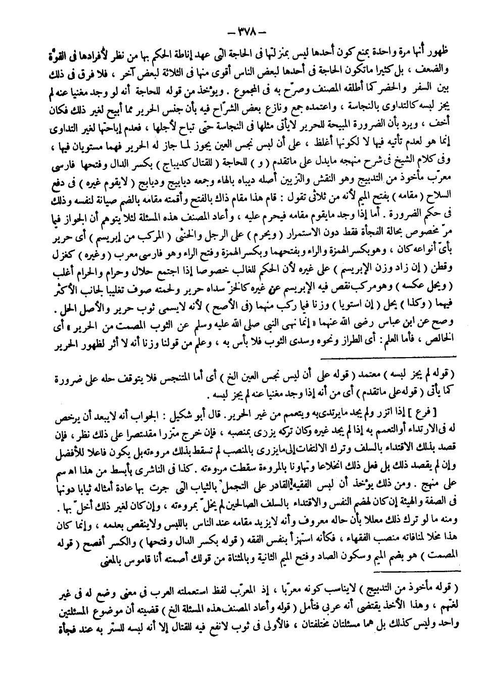 وَصَحَّ عَنْ ابْنِ عَبَّاسٍ - رَضِيَ اللَّهُ عَنْهُمَا - إنَّمَا «نَهَى النَّبِيُّ - صَلَّى اللَّهُ عَلَيْهِ وَسَلَّمَ - عَنْ الثَّوْبِ الْمُصْمَتِ مِنْ الْحَرِيرِ» أَيْ الْخَالِصِ، فَأَمَّا الْعَلَمُ: أَيْ الطِّرَازُ وَنَحْوُهُ وَسَدَى الثَّوْبِ فَلَا بَأْسَ بِهِ، وَعُلِمَ مِنْ قَوْلِنَا وَزْنًا أَنَّهُ لَا أَثَرَ لِظُهُورِ الْحَرِيرِ