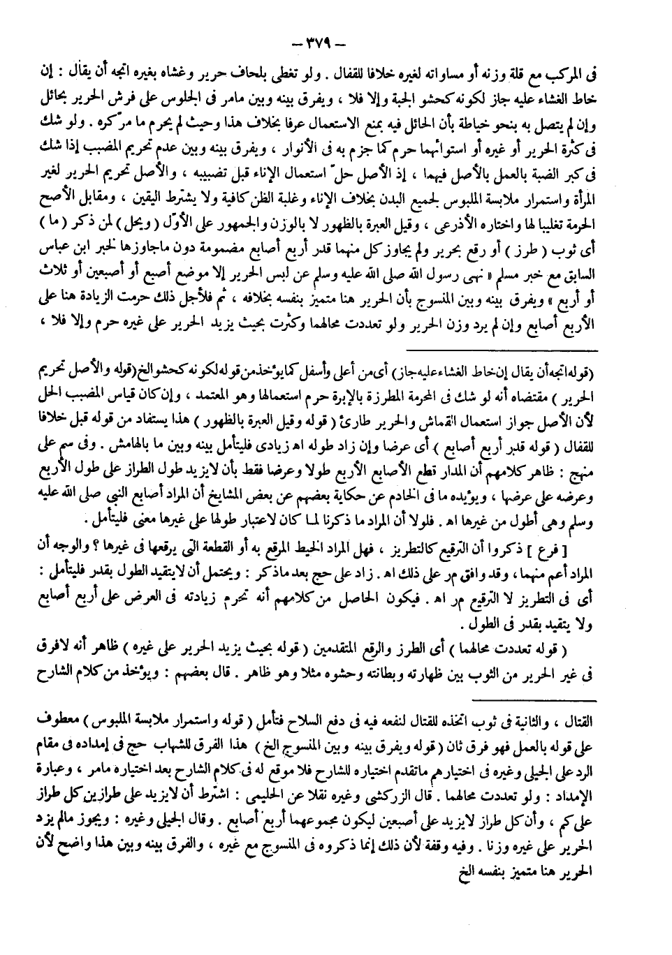 وَفِي سم عَلَى مَنْهَجٍ: ظَاهِرُ كَلَامِهِمْ أَنَّ الْمَدَارَ قَطْعُ الْأَصَابِعِ الْأَرْبَعِ طُولًا وَعَرْضًا فَقَطْ بِأَنْ لَا يَزِيدَ طُولُ الطِّرَازِ عَلَى طُولِ الْأَرْبَعِ وَعَرْضُهُ عَلَى عَرْضِهَا، وَيُؤَيِّدُهُ مَا فِي الْخَادِمِ عَنْ حِكَايَةِ بَعْضِهِمْ عَنْ بَعْضِ الْمَشَايِخِ أَنَّ الْمُرَادَ أَصَابِعُ النَّبِيِّ - صَلَّى اللَّهُ عَلَيْهِ وَسَلَّمَ - وَهِيَ أَطْوَلُ مِنْ غَيْرِهَا اهـ.