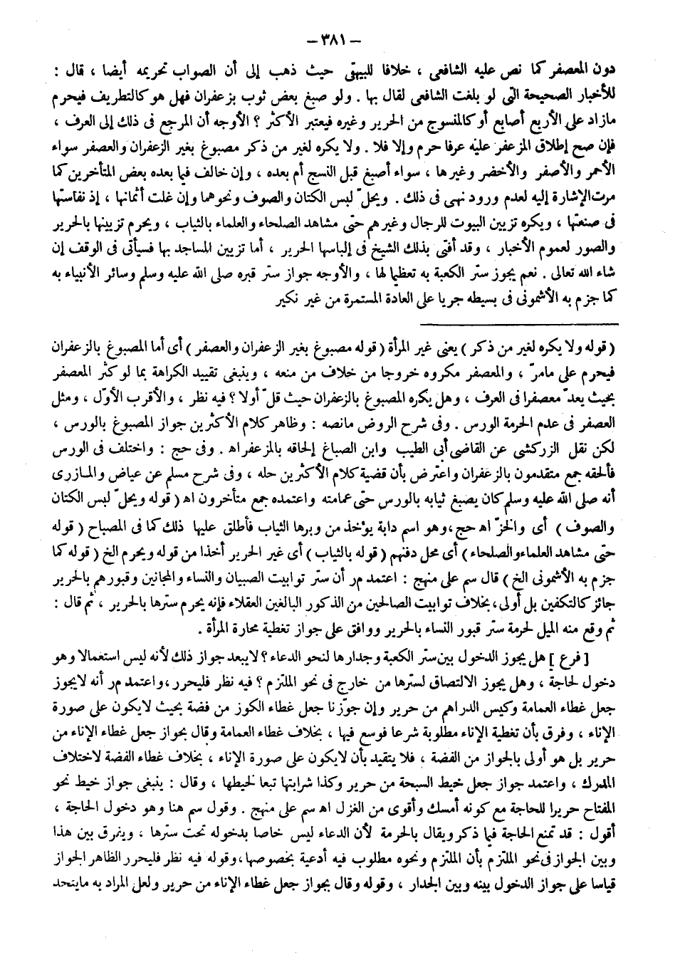 وَفِي حَجّ: وَاخْتُلِفَ فِي الْوَرْسِ فَأَلْحَقهُ جَمْعٌ مُتَقَدِّمُونَ بِالزَّعْفَرَانِ وَاعْتُرِضَ بِأَنَّ قَضِيَّةَ كَلَامِ الْأَكْثَرِينَ حِلُّهُ، وَفِي شَرْحِ مُسْلِمٍ عَنْ عِيَاضٍ وَالْمَازِرِيِّ «أَنَّهُ - صَلَّى اللَّهُ عَلَيْهِ وَسَلَّمَ - كَانَ يَصْبُغُ ثِيَابَهُ بِالْوَرْسِ حَتَّى عِمَامَتَهُ» وَاعْتَمَدَهُ جَمْعٌ مُتَأَخِّرُونَ اهـ