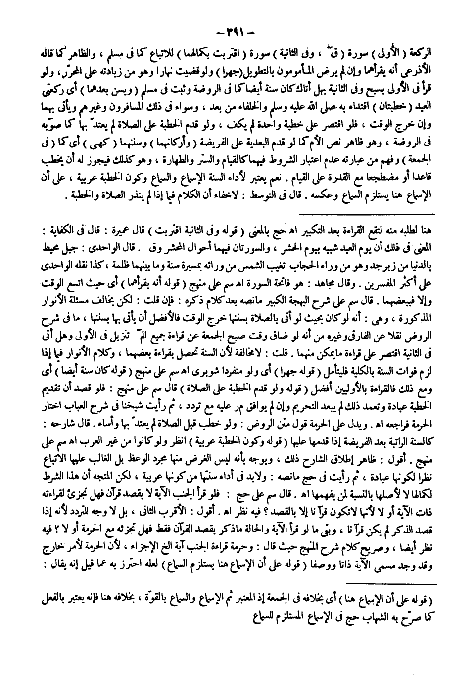 قَالَ سم عَلَى شَرْحِ الْبَهْجَةِ الْكَبِيرِ مَا نَصُّهُ بَعْدَ كَلَامٍ ذَكَرَهُ: فَإِنْ قُلْت: لَكِنْ يُخَالِفُ مَسْأَلَةَ الْأَنْوَارِ الْمَذْكُورَةِ، وَهِيَ: أَنَّهُ لَوْ كَانَ بِحَيْثُ لَوْ أَتَى بِالصَّلَاةِ بِسُنَنِهَا خَرَجَ الْوَقْتُ فَالْأَفْضَلُ أَنْ يَأْتِيَ بِهَا بِسُنَنِهَا، مَا فِي شَرْحِ الرَّوْضِ نَقْلًا عَنْ الفَارِقِيِّ وَغَيْرِهِ مِنْ أَنَّهُ لَوْ ضَاقَ وَقْتُ صُبْحِ الْجُمُعَةِ عَنْ قِرَاءَةِ جَمِيعِ {الم - تَنْزِيلُ} [السجدة: 1 - 2] فِي الْأُولَى وَهَلْ أَتَى فِي الثَّانِيَةِ اقْتَصَرَ عَلَى قِرَاءَةِ مَا يُمْكِنُ مِنْهُمَا.