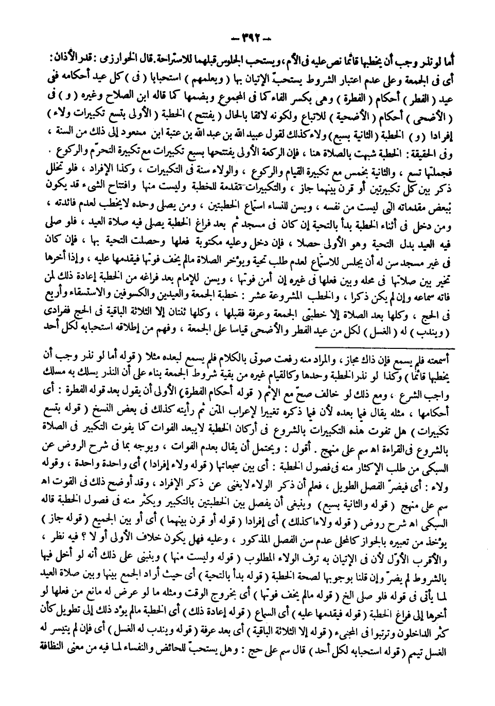 قَالَ الْخُوَارِزْمِيَّ: قَدْرَ الْأَذَانِ: أَيْ فِي الْجُمُعَةِ وَعَلَى عَدَمِ اعْتِبَارِ الشُّرُوطِ يُسْتَحَبُّ الْإِتْيَانُ بِهَا (وَيُعَلِّمُهُمْ) اسْتِحْبَابًا (فِي) كُلِّ عِيدٍ أَحْكَامَهُ فَفِي عِيدِ (الْفِطْرِ) أَحْكَامُ (الْفِطْرَةِ) وَهِيَ بِكَسْرِ الْفَاءِ كَمَا فِي الْمَجْمُوعِ وَبِضَمِّهَا كَمَا قَالَهُ ابْنُ الصَّلَاحِ وَغَيْرُهُ (وَ) فِي (الْأَضْحَى) أَحْكَامُ (الْأُضْحِيَّةَ) ؛ لِلِاتِّبَاعِ؛ وَلِكَوْنِهِ لَائِقًا بِالْحَالِ (يَفْتَتِحُ) الْخُطْبَةَ (الْأُولَى بِتِسْعِ تَكْبِيرَاتٍ وَلَاءً) إفْرَادًا (وَ) الْخُطْبَةَ (الثَّانِيَةَ بِسَبْعٍ) وَلَاءً كَذَلِكَ لِقَوْلِ عُبَيْدِ اللَّهِ بْنِ عَبْدِ اللَّهِ بْنِ عُتْبَةَ بْنِ مَسْعُودٍ إلَى ذَلِكَ مِنْ السُّنَّةِ، وَفِي الْحَقِيقَةِ: الْخُطْبَةُ شُبِّهَتْ بِالصَّلَاةِ هُنَا، فَإِنَّ الرَّكْعَةَ الْأُولَى يَفْتَتِحُهَا بِسَبْعِ تَكْبِيرَاتٍ مَعَ تَكْبِيرَةِ التَّحْرِيمِ وَالرُّكُوعِ. فَجُمْلَتُهَا تِسْعٌ، وَالثَّانِيَةَ بِخَمْسٍ مَعَ تَكْبِيرَةِ الْقِيَامِ وَالرُّكُوعِ، وَالْوَلَاءُ سُنَّةٌ فِي التَّكْبِيرَاتِ، وَكَذَا الْإِفْرَادُ، فَلَوْ تَخَلَّلَ ذِكْرٌ بَيْنَ كُلِّ تَكْبِيرَتَيْنِ أَوْ قَرَنَ بَيْنَهُمَا جَازَ، وَالتَّكْبِيرَاتُ مُقَدِّمَةٌ لِلْخُطْبَةِ وَلَيْسَتْ مِنْهَا وَافْتِتَاحُ الشَّيْءِ قَدْ يَكُونُ بِبَعْضِ مُقَدِّمَاتِهِ الَّتِي لَيْسَتْ مِنْ نَفْسِهِ، وَيُسَنُّ لِلنِّسَاءِ اسْتِمَاعُ الْخُطْبَتَيْنِ، وَمَنْ يُصَلِّي وَحْدَهُ لَا يَخْطُبُ لِعَدَمِ فَائِدَتِهِ، وَمَنْ دَخَلَ فِي أَثْنَاءِ الْخُطْبَةِ بَدَأَ بِالتَّحِيَّةِ إنْ كَانَ فِي مَسْجِدٍ ثُمَّ بَعْدَ فَرَاغِ الْخُطْبَةِ يُصَلِّي فِيهِ صَلَاةَ الْعِيدِ، فَلَوْ صَلَّى فِيهِ الْعِيدَ بَدَلَ التَّحِيَّةِ وَهُوَ الْأَوْلَى حَصَلَا، فَإِنْ دَخَلَ وَعَلَيْهِ مَكْتُوبَةٌ فَعَلَهَا وَحَصَلَتْ التَّحِيَّةُ بِهَا، فَإِنْ كَانَ فِي غَيْرِ مَسْجِدٍ سُنَّ لَهُ أَنْ يَجْلِسَ لِلِاسْتِمَاعِ لِعَدَمِ طَلَبِ تَحِيَّةٍ وَيُؤَخِّرَ الصَّلَاةَ مَا لَمْ يَخَفْ فَوْتَهَا فَيُقَدِّمُهَا عَلَيْهِ، وَإِذَا أَخَّرَهَا تَخَيَّرَ بَيْنَ صَلَاتِهَا فِي مَحَلِّهِ وَبَيْنَ فِعْلِهَا فِي غَيْرِهِ إنْ أَمِنَ فَوْتَهَا، وَيُسَنُّ لِلْإِمَامِ بَعْدَ فَرَاغِهِ مِنْ الْخُطْبَةِ إعَادَةُ ذَلِكَ لِمَنْ فَاتَهُ سَمَاعُهُ وَإِنْ لَمْ يَكُنْ ذِكْرًا، وَالْخُطَبُ الْمَشْرُوعَةُ عَشْرٌ: خُطْبَةُ الْجُمُعَةِ وَالْعِيدَيْنِ وَالْكُسُوفَيْنِ وَالِاسْتِسْقَاءِ وَأَرْبَعٍ فِي الْحَجِّ، وَكُلُّهَا بَعْدَ الصَّلَاةِ إلَّا خُطْبَتَيْ الْجُمُعَةِ وَعَرَفَةَ فَقَبْلَهَا، وَكُلُّهَا ثِنْتَانِ إلَّا الثَّلَاثَةَ الْبَاقِيَةَ فِي الْحَجِّ فَفُرَادَى.