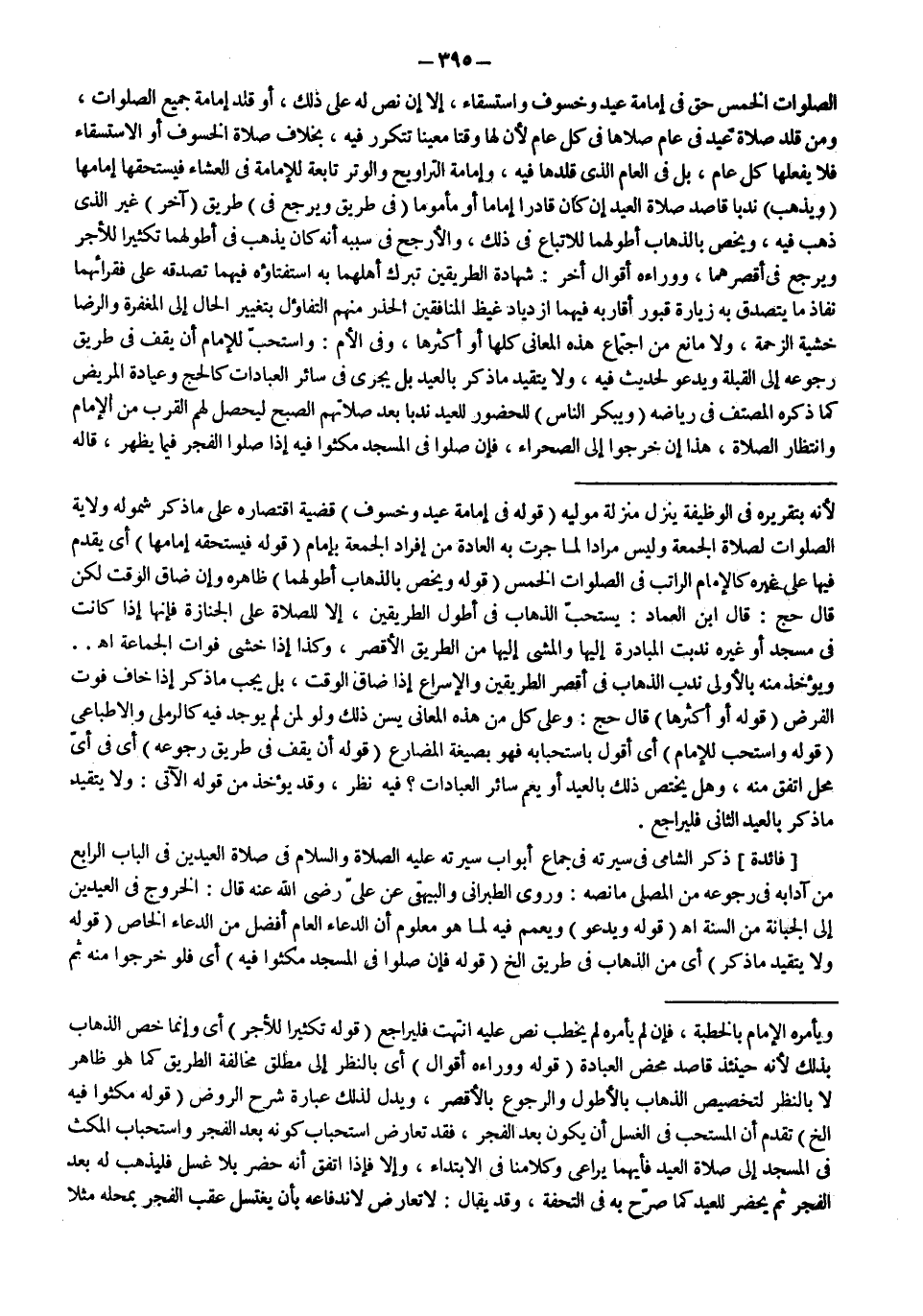 وَيُؤْخَذُ مِنْهُ بِالْأَوْلَى نَدْبُ الذَّهَابِ فِي أَقْصَرِ الطَّرِيقِينَ وَالْإِسْرَاعُ إذَا ضَاقَ الْوَقْتُ، بَلْ يَجِبُ مَا ذُكِرَ إذَا خَافَ فَوْتَ الْفَرْضِ (قَوْلُهُ: أَوْ أَكْثَرُهَا) قَالَ حَجّ: وَعَلَى كُلٍّ مِنْ هَذِهِ الْمَعَانِي يُسَنُّ ذَلِكَ وَلَوْ لِمَنْ لَمْ يُوجَدْ فِيهِ كَالرَّمْلِيِّ وَالْأَطْبَاعِيِّ (قَوْلُهُ: وَأَسْتَحِبُّ لِلْإِمَامِ) أَيْ أَقُولُ بِاسْتِحْبَابِهِ فَهُوَ بِصِيغَةِ الْمُضَارِعِ (قَوْلُهُ: أَنْ يَقِفَ فِي طَرِيقِ رُجُوعِهِ) أَيْ فِي أَيِّ مَحَلٍّ اتَّفَقَ مِنْهُ، وَهَلْ يَخْتَصُّ ذَلِكَ بِالْعِيدِ أَوْ يَعُمُّ سَائِرَ الْعِبَادَاتِ؟ فِيهِ نَظَرٌ، وَقَدْ يُؤْخَذُ مِنْ قَوْلِهِ الْآتِي: وَلَا يَتَقَيَّدُ مَا ذُكِرَ بِالْعِيدِ الثَّانِي فَلْيُرَاجَعْ.
