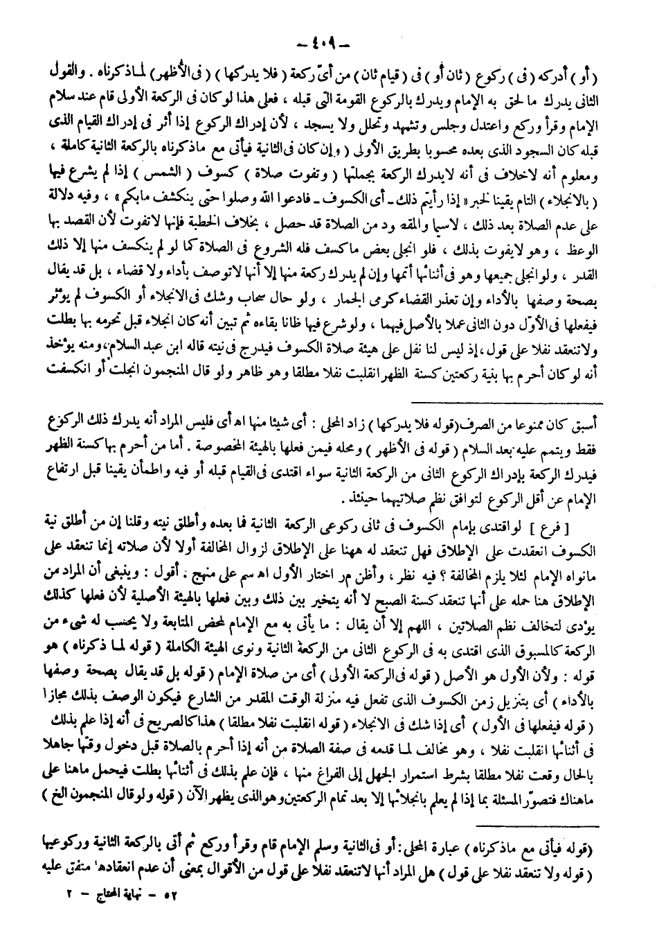 [فَرْعٌ] لَوْ اقْتَدَى بِإِمَامِ الْكُسُوفِ فِي ثَانِي رُكُوعَيْ الرَّكْعَةِ الثَّانِيَةِ فَمَا بَعْدَهُ وَأَطْلَقَ نِيَّتَهُ وَقُلْنَا إنَّ مَنْ أَطْلَقَ نِيَّةَ الْكُسُوفِ انْعَقَدَتْ عَلَى الْإِطْلَاقِ فَهَلْ تَنْعَقِدُ لَهُ هَهُنَا عَلَى الْإِطْلَاقِ لِزَوَالِ الْمُخَالَفَةِ أَوَّلًا؛ لِأَنَّ صَلَاتَهُ إنَّمَا تَنْعَقِدُ عَلَى مَا نَوَاهُ الْإِمَامُ لِئَلَّا يَلْزَمَ الْمُخَالَفَةُ؟ فِيهِ نَظَرٌ، وَأَظُنُّ م ر اخْتَارَ الْأَوَّلَ اهـ سم عَلَى مَنْهَجٍ. أَقُولُ: وَيَنْبَغِي أَنَّ الْمُرَادَ مِنْ الْإِطْلَاقِ هُنَا حَمْلُهُ عَلَى أَنَّهَا تَنْعَقِدُ كَسُنَّةِ الصُّبْحِ لَا أَنَّهُ يَتَخَيَّرُ بَيْنَ ذَلِكَ وَبَيْنَ فِعْلِهَا بِالْهَيْئَةِ الْأَصْلِيَّةِ؛ لِأَنَّ فِعْلَهَا كَذَلِكَ يُؤَدِّي لِتَخَالُفِ نَظْمِ الصَّلَاتَيْنِ، اللَّهُمَّ إلَّا أَنْ يُقَالَ: مَا يَأْتِي بِهِ مَعَ الْإِمَامِ لِمَحْضِ الْمُتَابَعَةِ وَلَا يُحْسَبُ لَهُ شَيْءٌ مِنْ الرَّكْعَةِ كَالْمَسْبُوقِ الَّذِي اقْتَدَى بِهِ فِي الرُّكُوعِ الثَّانِي مِنْ الرَّكْعَةِ الثَّانِيَةِ وَنَوَى الْهَيْئَةَ الْكَامِلَةَ (قَوْلُهُ لِمَا ذَكَرْنَاهُ) هُوَ قَوْلُهُ: وَلِأَنَّ الْأَوَّلَ هُوَ الْأَصْلُ (قَوْلُهُ: فِي الرَّكْعَةِ الْأُولَى) أَيْ مِنْ صَلَاةِ الْإِمَامِ (قَوْلُهُ: بَلْ قَدْ يُقَالُ بِصِحَّةِ وَصْفِهَا بِالْأَدَاءِ) أَيْ بِتَنْزِيلِ زَمَنِ الْكُسُوفِ الَّذِي تُفْعَلُ فِيهِ مَنْزِلَةَ الْوَقْتِ الْمُقَدَّرِ مِنْ الشَّارِعِ فَيَكُونُ الْوَصْفُ بِذَلِكَ مَجَازًا (قَوْلُهُ: فَيَفْعَلُهَا فِي الْأَوَّلِ) أَيْ إذَا شَكَّ فِي الِانْجِلَاءِ (قَوْلُهُ: انْقَلَبَتْ نَفْلًا مُطْلَقًا) هَذَا كَالصَّرِيحِ فِي أَنَّهُ إذَا عَلِمَ بِذَلِكَ فِي أَثْنَائِهَا انْقَلَبَتْ نَفْلًا، وَهُوَ مُخَالِفٌ لِمَا قَدَّمَهُ فِي صِفَةِ الصَّلَاةِ مِنْ أَنَّهُ إذَا أَحْرَمَ بِالصَّلَاةِ قَبْلَ دُخُولِ وَقْتِهَا جَاهِلًا بِالْحَالِ وَقَعَتْ نَفْلًا مُطْلَقًا بِشَرْطِ اسْتِمْرَارِ الْجَهْلِ إلَى الْفَرَاغِ مِنْهَا، فَإِنْ عَلِمَ بِذَلِكَ فِي أَثْنَائِهَا بَطَلَتْ فَيُحْمَلُ مَا هُنَا عَلَى مَا هُنَاكَ فَتَصَوَّرْ الْمَسْأَلَةَ بِمَا إذَا لَمْ يَعْلَمْ بِانْجِلَائِهَا إلَّا بَعْدَ تَمَامِ الرَّكْعَتَيْنِ وَهُوَ الَّذِي يَظْهَرُ الْآنَ (قَوْلُهُ: وَلَوْ قَالَ الْمُنَجِّمُونَ إلَخْ)
