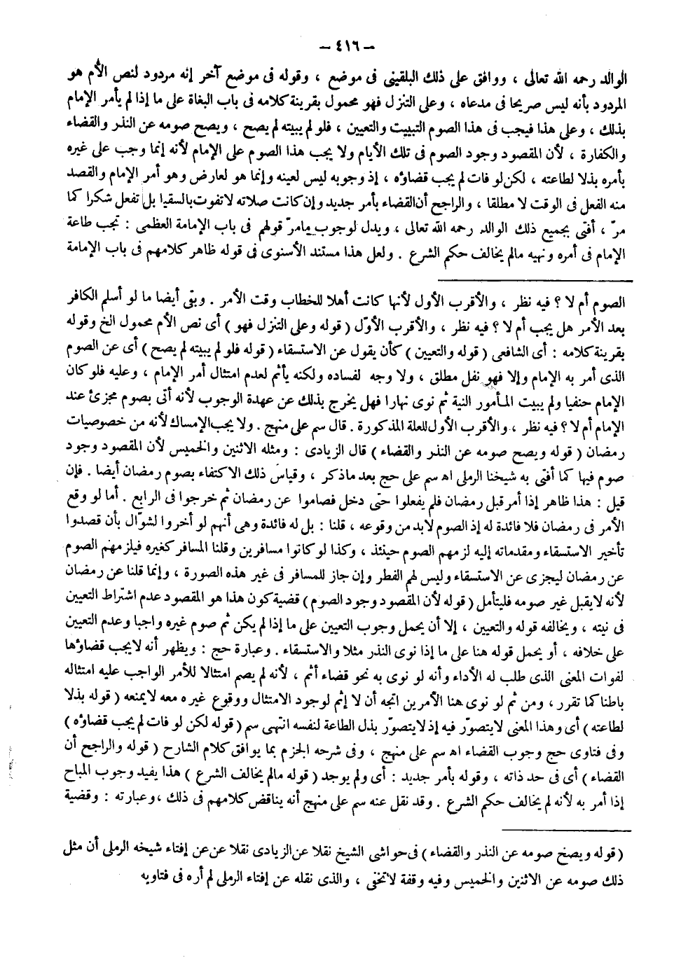 الْوَالِدُ - رَحِمَهُ اللَّهُ تَعَالَى -، وَوَافَقَ عَلَى ذَلِكَ الْبُلْقِينِيُّ فِي مَوْضِعٍ، وَقَوْلُهُ فِي مَوْضِعٍ آخَرَ إنَّهُ مَرْدُودٌ لِنَصِّ الْأُمِّ هُوَ الْمَرْدُودُ بِأَنَّهُ لَيْسَ صَرِيحًا فِي مُدَّعَاهُ، وَعَلَى التَّنَزُّلِ فَهُوَ مَحْمُولٌ بِقَرِينَةِ كَلَامِهِ فِي بَابِ الْبُغَاةِ عَلَى مَا إذَا لَمْ يَأْمُرْ الْإِمَامُ بِذَلِكَ، وَعَلَى هَذَا فَيَجِبُ فِي هَذَا الصَّوْمِ التَّبْيِيتُ وَالتَّعْيِينُ، فَلَوْ لَمْ يُبَيِّتْهُ لَمْ يَصِحَّ، وَيَصِحُّ صَوْمُهُ عَنْ النَّذْرِ وَالْقَضَاءِ وَالْكَفَّارَةِ؛ لِأَنَّ الْمَقْصُودَ وُجُودُ الصَّوْمِ فِي تِلْكَ الْأَيَّامِ وَلَا يَجِبُ هَذَا الصَّوْمُ عَلَى الْإِمَامِ لِأَنَّهُ إنَّمَا وَجَبَ عَلَى غَيْرِهِ بِأَمْرِهِ بَذْلًا لِطَاعَتِهِ، لَكِنْ لَوْ فَاتَ لَمْ يَجِبْ قَضَاؤُهُ، إذْ وُجُوبُهُ لَيْسَ لِعَيْنِهِ وَإِنَّمَا هُوَ لِعَارِضٍ وَهُوَ أَمْرُ الْإِمَامِ وَالْقَصْدُ مِنْهُ الْفِعْلُ فِي الْوَقْتِ لَا مُطْلَقًا، وَالرَّاجِحُ أَنَّ الْقَضَاءَ بِأَمْرٍ جَدِيدٍ وَإِنْ كَانَتْ صَلَاتُهُ لَا تَفُوتُ بِالسُّقْيَا بَلْ تُفْعَلُ شُكْرًا كَمَا مَرَّ، أَفْتَى بِجَمِيعِ ذَلِكَ الْوَالِدُ - رَحِمَهُ اللَّهُ تَعَالَى -، وَيَدُلُّ لِوُجُوبِ مَا مَرَّ قَوْلُهُمْ فِي بَابِ الْإِمَامَةِ الْعُظْمَى: تَجِبُ طَاعَةُ الْإِمَامِ فِي أَمْرِهِ وَنَهْيِهِ مَا لَمْ يُخَالِفْ حُكْمَ الشَّرْعِ. وَلَعَلَّ هَذَا مُسْتَنَدُ الْإِسْنَوِيِّ فِي قَوْلِهِ ظَاهِرُ كَلَامِهِمْ فِي بَابِ الْإِمَامَةِ