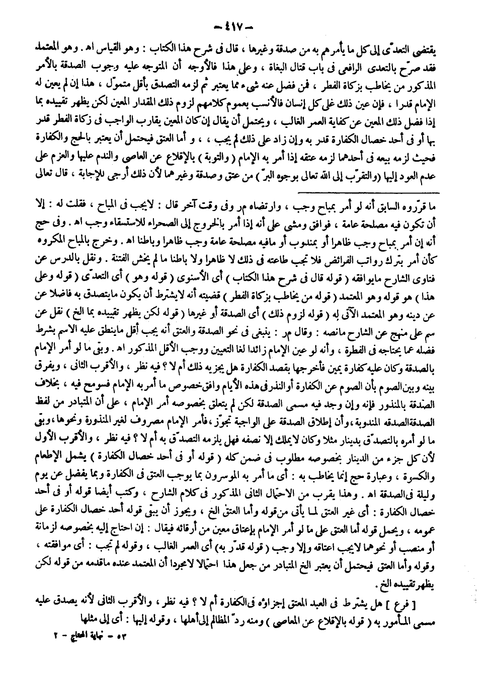 ـــــــــــــــــــــــــــــSمَا قَرَّرَهُ السَّابِقَ أَنَّهُ لَوْ أَمَرَ بِمُبَاحٍ وَجَبَ، وَارْتَضَاهُ م ر وَفِي وَقْتٍ آخَرَ قَالَ: لَا يَجِبُ فِي الْمُبَاحِ، فَقُلْت لَهُ: إلَّا أَنْ تَكُونَ فِيهِ مَصْلَحَةٌ عَامَّةٌ، فَوَافَقَ وَمَشَى عَلَى أَنَّهُ إذَا أَمَرَ بِالْخُرُوجِ إلَى الصَّحْرَاءِ لِلِاسْتِسْقَاءِ وَجَبَ اهـ. وَفِي حَجّ أَنَّهُ إنْ أَمَرَ بِمُبَاحٍ وَجَبَ ظَاهِرًا أَوْ بِمَنْدُوبٍ أَوْ مَا فِيهِ مَصْلَحَةٌ عَامَّةٌ وَجَبَ ظَاهِرًا وَبَاطِنًا اهـ. وَخَرَجَ بِالْمُبَاحِ الْمَكْرُوهِ كَأَنْ أَمَرَ بِتَرْكِ رَوَاتِبِ الْفَرَائِضِ فَلَا تَجِبُ طَاعَتُهُ فِي ذَلِكَ لَا ظَاهِرًا وَلَا بَاطِنًا مَا لَمْ يَخْشَ الْفِتْنَةَ. وَنُقِلَ بِالدَّرْسِ عَنْ فَتَاوَى الشَّارِحِ مَا يُوَافِقُهُ (قَوْلُهُ: قَالَ فِي شَرْحِ هَذَا الْكِتَابِ) أَيْ الْإِسْنَوِيُّ (قَوْلُهُ: وَهُوَ) أَيْ التَّعَدِّي (قَوْلُهُ: وَعَلَى هَذَا) هُوَ قَوْلُهُ وَهُوَ الْمُعْتَمَدُ (قَوْلُهُ: مَنْ يُخَاطَبُ بِزَكَاةِ الْفِطْرِ) قَضِيَّتُهُ أَنَّهُ لَا يُشْتَرَطُ أَنْ يَكُونَ مَا يَتَصَدَّقُ بِهِ فَاضِلًا عَنْ دَيْنِهِ وَهُوَ الْمُعْتَمَدُ الْآتِي لَهُ (قَوْلُهُ: لُزُومُ ذَلِكَ) أَيْ الصَّدَقَةِ أَوْ غَيْرِهَا (قَوْلُهُ لَكِنْ يَظْهَرُ تَقْيِيدُهُ بِمَا إلَخْ) نُقِلَ عَنْ سم عَلَى مَنْهَجٍ عَنْ الشَّارِحِ مَا نَصُّهُ: وَقَالَ م ر: يَنْبَغِي فِي نَحْوِ الصِّدْقِ وَالْعِتْقِ أَنَّهُ يَجِبُ أَقَلُّ مَا يَنْطِقُ عَلَيْهِ الِاسْمُ بِشَرْطِ فَضْلِهِ عَمَّا يَحْتَاجُهُ فِي الْفِطْرِ، وَأَنَّهُ لَوْ عَيَّنَ الْإِمَامُ زَائِدًا لَغَا التَّعْيِينُ وَوَجَبَ الْأَقَلُّ الْمَذْكُورُ اهـ. وَبَقِيَ مَا لَوْ أَمَرَ الْإِمَامُ بِالصَّدَقَةِ وَكَانَ عَلَيْهِ كَفَّارَةُ يَمِينٍ فَأَخْرَجَهَا بِقَصْدِ الْكَفَّارَةِ هَلْ يُجْزِيهِ ذَلِكَ أَمْ لَا؟ فِيهِ نَظَرٌ، وَالْأَقْرَبُ الثَّانِي، وَيُفَرَّقُ بَيْنَهُ وَبَيْنَ الصَّوْمِ بِأَنَّ الصَّوْمَ عَنْ الْكَفَّارَةِ أَوْ النَّذْرِ فِي هَذِهِ الْأَيَّامِ وَافَقَ خُصُوصَ مَا أَمَرَ بِهِ الْإِمَامُ فَسُومِحَ فِيهِ، بِخِلَافِ الصَّدَقَةِ بِالْمَنْذُورِ فَإِنَّهُ وَإِنْ وَجَدَ فِيهِ مُسَمَّى الصَّدَقَةِ لَكِنْ لَمْ يَتَعَلَّقْ بِخُصُوصِهِ أَمْرُ الْإِمَامِ، عَلَى أَنَّ الْمُتَبَادَرَ مِنْ لَفْظِ الصَّدَقَةِ الصَّدَقَةُ الْمَنْدُوبَةُ، وَأَنَّ إطْلَاقَ الصَّدَقَةِ عَلَى الْوَاجِبَةِ تَجُوزُ، فَأَمْرُ الْإِمَامِ مَصْرُوفٌ لِغَيْرِ الْمَنْذُورَةِ وَنَحْوِهَا، وَبَقِيَ مَا لَوْ أَمَرَهُ بِالتَّصَدُّقِ بِدِينَارٍ مَثَلًا وَكَانَ لَا يَمْلِكُ إلَّا نِصْفَهُ فَهَلْ يَلْزَمُهُ التَّصَدُّقُ بِهِ أَمْ لَا؟ فِيهِ نَظَرٌ، وَالْأَقْرَبُ الْأَوَّلُ؛ لِأَنَّ كُلَّ جُزْءٍ مِنْ الدِّينَارِ بِخُصُوصِهِ مَطْلُوبٌ فِي ضِمْنِ كُلِّهِ (قَوْلُهُ: أَوْ فِي أَحَدِ خِصَالِ الْكَفَّارَةِ) يَشْمَلُ الْإِطْعَامَ وَالْكِسْوَةَ، وَعِبَارَةُ حَجّ إنَّمَا يُخَاطَبُ بِهِ: أَيْ مَا أَمَرَ بِهِ الْمُوسِرُونَ بِمَا يُوجِبُ الْعِتْقَ فِي الْكَفَّارَةِ وَبِمَا يَفْضُلُ عَنْ يَوْمٍ وَلَيْلَةٍ فِي الصَّدَقَةِ اهـ. وَهَذَا يَقْرُبُ مِنْ الِاحْتِمَالِ الثَّانِي الْمَذْكُورِ فِي كَلَامِ الشَّارِحِ، وَكَتَبَ أَيْضًا قَوْلَهُ أَوْ فِي أَحَدِ خِصَالِ الْكَفَّارَةِ: أَيْ غَيْرِ الْعِتْقِ لِمَا يَأْتِي مِنْ قَوْلِهِ وَأَمَّا الْعِتْقُ إلَخْ، وَيَجُوزُ أَنْ يَبْقَى قَوْلُهُ أَحَدَ خِصَالِ الْكَفَّارَةِ عَلَى عُمُومِهِ، وَيُحْمَلُ قَوْلُهُ أَمَّا الْعِتْقُ عَلَى مَا لَوْ أَمَرَ الْإِمَامُ بِإِعْتَاقِ مُعَيَّنٍ مِنْ أَرِقَّائِهِ فَيُقَالُ: إنْ احْتَاجَ إلَيْهِ بِخُصُوصِهِ لِزَمَانَةٍ أَوْ مَنْصِبٍ أَوْ نَحْوِهِ