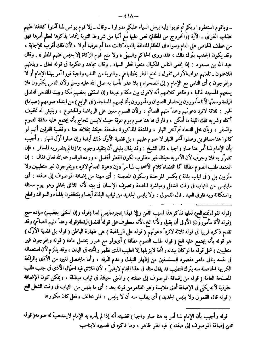 {وَيَا قَوْمِ اسْتَغْفِرُوا رَبَّكُمْ ثُمَّ تُوبُوا إِلَيْهِ يُرْسِلِ السَّمَاءَ عَلَيْكُمْ مِدْرَارًا} [هود: 52] وَقَالَ {إِلا قَوْمَ يُونُسَ لَمَّا آمَنُوا كَشَفْنَا عَنْهُمْ عَذَابَ الْخِزْيِ} [يونس: 98] الْآيَةُ (وَالْخُرُوجُ مِنْ الْمَظَالِمِ) نَصَّ عَلَيْهِ مَعَ أَنَّهَا مِنْ شُرُوطِ التَّوْبَةِ إتْمَامًا بِذِكْرِهَا لِعِظَمِ أَمْرِهَا فَهُوَ مِنْ عَطْفِ الْخَاصِّ عَلَى الْعَامِّ وَسَوَاءٌ فِي الْمَظَالِمِ الْمُتَعَلِّقَةِ بِالْعِبَادِ كَانَتْ دَمًا أَمْ عِرْضًا أَمْ لَا؛ لِأَنَّ ذَلِكَ أَقْرَبُ لِلْإِجَابَةِ.