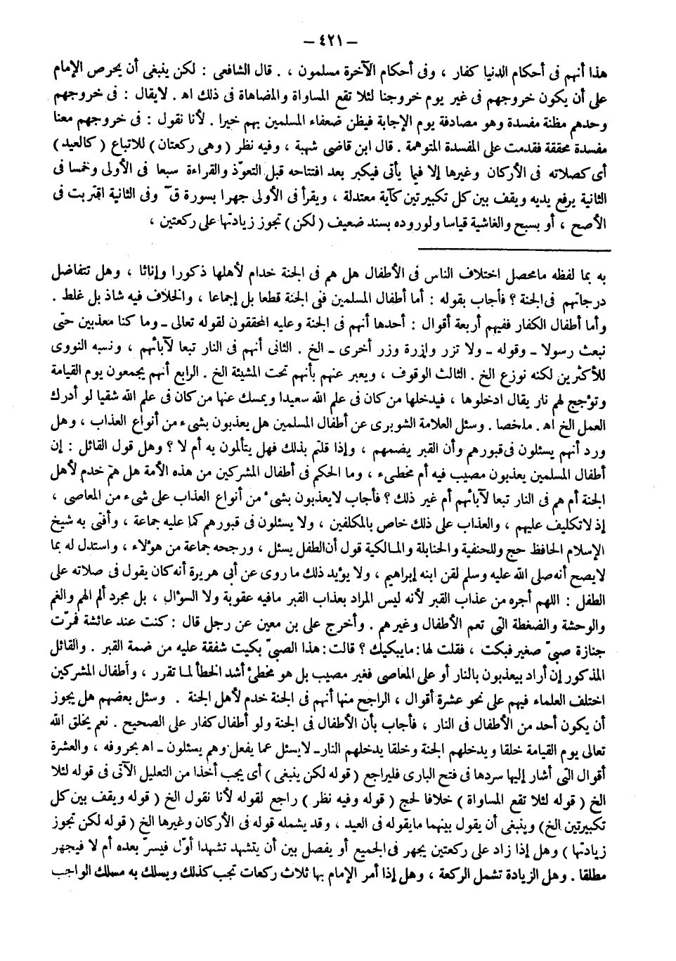 ـــــــــــــــــــــــــــــSبِهِ بِمَا لَفْظُهُ مَا مُحَصِّلُ اخْتِلَافِ النَّاسِ فِي الْأَطْفَالِ هَلْ هُمْ فِي الْجَنَّةِ خُدَّامٌ لِأَهْلِهَا ذُكُورًا وَإِنَاثًا، وَهَلْ تَتَفَاضَلُ دَرَجَاتُهُمْ فِي الْجَنَّةِ؟ فَأَجَابَ بِقَوْلِهِ: أَمَّا أَطْفَالُ الْمُسْلِمِينَ فَفِي الْجَنَّةِ قَطْعًا بَلْ إجْمَاعًا، وَالْخِلَافُ فِيهِ شَاذٌّ بَلْ غَلَطٌ.