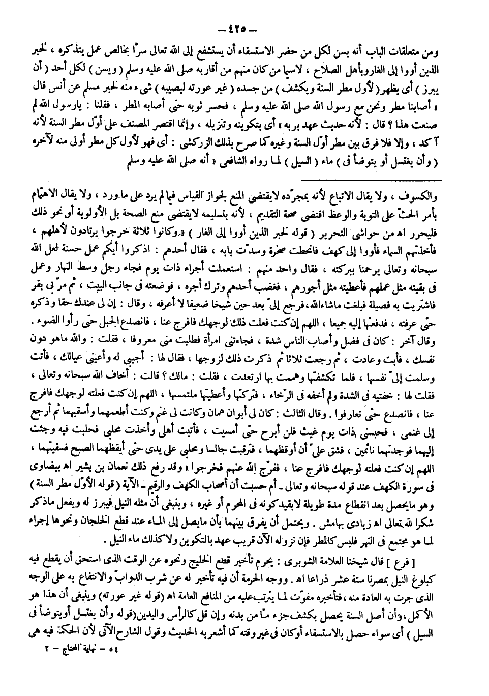 وَقَدْ رَفَعَ ذَلِكَ نُعْمَانُ بْنُ بَشِيرٍ اهـ بَيْضَاوِيٌّ فِي سُورَةِ الْكَهْفِ عِنْدَ قَوْلِهِ سُبْحَانَهُ وَتَعَالَى {أَمْ حَسِبْتَ أَنَّ أَصْحَابَ الْكَهْفِ وَالرَّقِيمِ} [الكهف: 9] الْآيَةَ (قَوْلُهُ: لِأَوَّلِ مَطَرِ السُّنَّةِ) وَهُوَ مَا يَحْصُلُ بَعْدَ انْقِطَاعِ مُدَّةٍ طَوِيلَةٍ لَا بِقَيْدِ كَوْنِهِ فِي الْمُحَرَّمِ أَوْ غَيْرِهِ، وَيَنْبَغِي أَنَّ مِثْلَهُ النِّيلُ فَيَبْرُزُ لَهُ وَيَفْعَلُ مَا ذَكَرَ شُكْرًا لِلَّهِ تَعَالَى اهـ زِيَادِي بِهَامِشٍ. وَيُحْتَمَلُ أَنْ يُفَرَّقَ بَيْنَهُمَا بِأَنَّ مَا يَصِلُ إلَى الْمَاءِ عِنْدَ قَطْعِ الْخُلْجَانِ وَنَحْوِهَا إجْرَاءٌ لِمَا هُوَ مُجْتَمِعٌ فِي النَّهْرِ فَلَيْسَ كَالْمَطَرِ فَإِنَّ نُزُولَهُ الْآنَ قَرِيبُ عَهْدٍ بِالتَّكْوِينِ وَلَا كَذَلِكَ مَاءُ النِّيلِ.