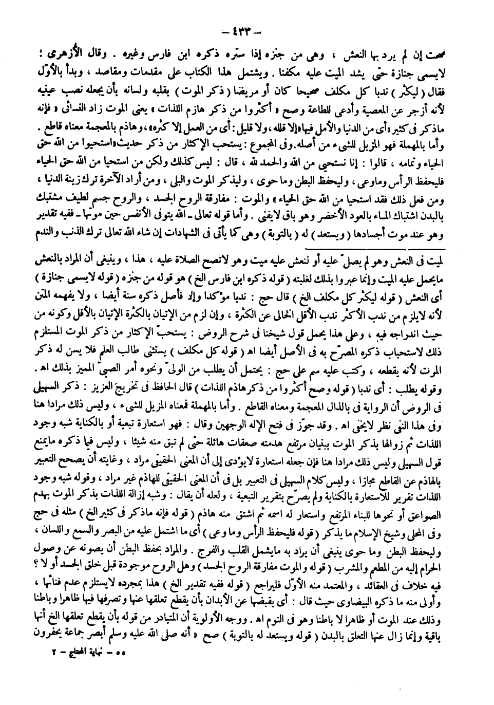 صَحَّتْ إنْ لَمْ يُرِدْ بِهَا النَّعْشَ، وَهِيَ مِنْ جَنَزَهُ إذَا سَتَرَهُ ذَكَرَهُ ابْنُ فَارِسٍ وَغَيْرُهُ، وَقَالَ الْأَزْهَرِيُّ: لَا يُسَمَّى جِنَازَةً حَتَّى يُشَدَّ الْمَيِّتُ عَلَيْهِ مُكَفَّنًا، وَيَشْتَمِلُ هَذَا الْكِتَابُ عَلَى مُقَدِّمَاتٍ وَمَقَاصِدَ، وَبَدَأَ بِالْأَوَّلِ فَقَالَ (لِيُكْثِرَ) نَدْبًا كُلَّ مُكَلَّفٍ صَحِيحًا كَانَ، أَوْ مَرِيضًا (ذِكْرَ الْمَوْتِ) بِقَلْبِهِ وَلِسَانِهِ بِأَنْ يَجْعَلَهُ نُصُبَ عَيْنَيْهِ؛ لِأَنَّهُ أُزْجَرُ عَنْ الْمَعْصِيَةِ وَأَدْعَى لِلطَّاعَةِ وَصَحَّ «أَكْثِرُوا مِنْ ذِكْرِ هَاذِمِ اللَّذَّاتِ» يَعْنِي الْمَوْتَ زَادَ النَّسَائِيّ «فَإِنَّهُ مَا ذُكِرَ فِي كَثِيرٍ أَيْ مِنْ الدُّنْيَا وَالْأَمَلِ فِيهَا إلَّا قَلَّلَهُ، وَلَا قَلِيلٍ: أَيْ مِنْ الْعَمَلِ إلَّا كَثَّرَهُ» ، وَهَاذِمُ بِالْمُعْجَمَةِ مَعْنَاهُ قَاطِعُ.