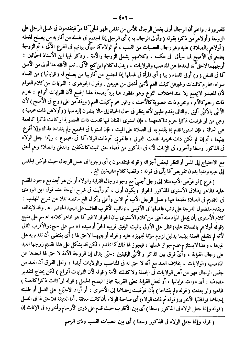 وَاعْلَمْ أَنَّ الرِّجَالَ أَوْلَى بِغُسْلِ الرِّجَالِ لِلْأَمْنِ مِنْ نَقْضِ طُهْرِ الْحَيِّ كَمَا مَرَّ فَيَتَقَدَّمُونَ فِي غُسْلِ الرَّجُلِ عَلَى الزَّوْجَةِ وَأَوْلَاهُمْ مَنْ ذَكَرَهُ بِقَوْلِهِ (وَأَوْلَى الرِّجَالِ بِهِ) أَيْ الرَّجُلِ إذَا اجْتَمَعَ فِي غُسْلِهِ مِنْ أَقَارِبِهِ مَنْ يَصْلُحُ لِغُسْلِهِ (أَوْلَاهُمْ بِالصَّلَاةِ) عَلَيْهِ وَهُمْ رِجَالُ الْعَصَبَاتِ مِنْ النَّسَبِ، ثُمَّ الْوَلَاءِ كَمَا سَيَأْتِي بَيَانُهُمْ فِي الْفَرْعِ الْآتِي، ثُمَّ الزَّوْجَةُ بَعْدَهُمْ فِي الْأَصَحِّ لِمَا سَيَأْتِي فِي عَكْسِهِ، وَكَلَامُهُمْ يَشْمَلُ الزَّوْجَةَ وَالْأَمَةَ، وَذَكَرَ فِيهَا ابْنُ الْأُسْتَاذِ احْتِمَالَيْنِ: أَوْجَهُهُمَا لَا حَقَّ لَهَا لِبُعْدِهَا عَنْ الْمَنَاصِبِ وَالْوِلَايَاتِ، وَيَدُلُّ لَهُ كَلَامُ ابْنِ كَجٍّ الْآتِي، نَعَمْ الْأَفْقَهُ هُنَا أَوْلَى مِنْ الْأَسَنِّ كَمَا فِي الدَّفْنِ (وَ) أَوْلَى النِّسَاءِ (بِهَا) أَيْ الْمَرْأَةِ فِي غُسْلِهَا إذَا اجْتَمَعَ مِنْ أَقَارِبِهَا مَنْ يَصْلُحُ لَهُ (قَرَابَاتُهَا) مِنْ النِّسَاءِ سَوَاءٌ الْمَحَارِمُ كَالْبَنَاتِ وَغَيْرِهِنَّ كَبِنْتِ الْعَمِّ لِأَنَّهُنَّ أَشْفَقُ مِنْ غَيْرِهِنَّ، وَقَوْلُ الْجَوْهَرِيِّ: الْقَرَابَاتُ مِنْ كَلَامِ الْعَوَامّ؛ لِأَنَّ الْمَصْدَرَ لَا يُجْمَعُ إلَّا عِنْدَ اخْتِلَافِ النَّوْعِ وَهُوَ مَفْقُودٌ هُنَا يُرَدُّ بِصِحَّةِ هَذَا الْجَمْعِ؛ لِأَنَّ الْقَرَابَاتِ أَنْوَاعٌ: مَحْرَمٌ ذَاتُ رَحِمٍ كَالْأُمِّ، وَمَحْرَمٌ ذَاتُ عُصُوبَةٍ كَالْأُخْتِ، وَغَيْرُ مَحْرَمٍ كَبِنْتِ الْعَمِّ.