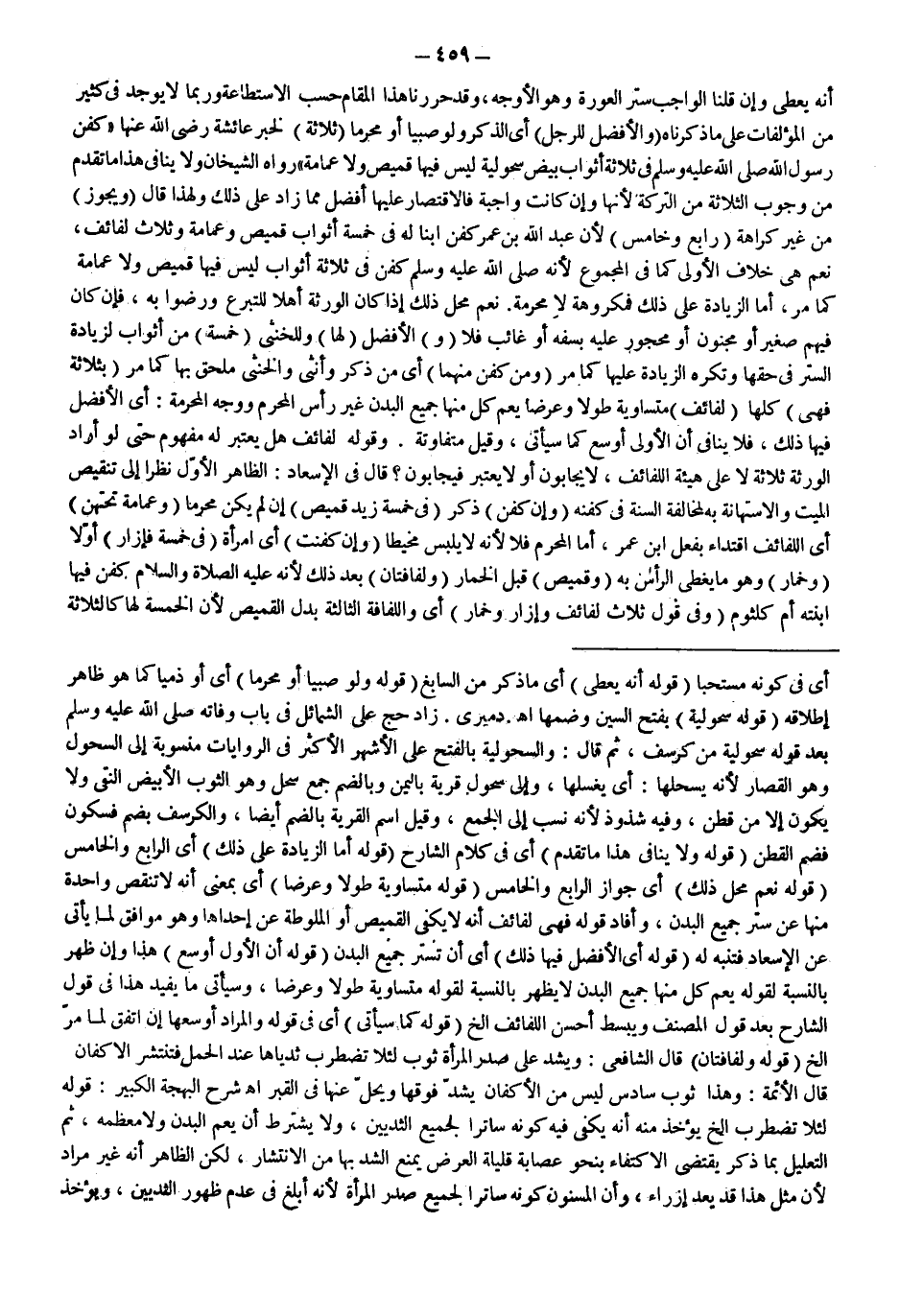 أَنَّهُ يُعْطَى وَإِنْ قُلْنَا الْوَاجِبُ سَتْرُ الْعَوْرَةِ وَهُوَ الْأَوْجَهُ، وَقَدْ حَرَّرْنَا هَذَا الْمَقَامَ حَسَبَ الِاسْتِطَاعَةِ وَرُبَّمَا لَا يُوجَدُ فِي كَثِيرٍ مِنْ الْمُؤَلَّفَاتِ عَلَى مَا ذَكَرْنَاهُ (وَالْأَفْضَلُ لِلرَّجُلِ) أَيْ الذَّكَرِ وَلَوْ صَبِيًّا أَوْ مُحْرِمًا (ثَلَاثَةٌ) لِخَبَرِ عَائِشَةَ - رَضِيَ اللَّهُ عَنْهَا - «كُفِّنَ رَسُولُ اللَّهِ - صَلَّى اللَّهُ عَلَيْهِ وَسَلَّمَ - فِي ثَلَاثَةِ أَثْوَابٍ بِيضٍ سُحُولِيَّةٍ لَيْسَ فِيهَا قَمِيصٌ وَلَا عِمَامَةٌ» رَوَاهُ الشَّيْخَانِ وَلَا يُنَافِي هَذَا مَا تَقَدَّمَ مِنْ وُجُوبِ الثَّلَاثَةِ مِنْ التَّرِكَةِ؛ لِأَنَّهَا وَإِنْ كَانَتْ وَاجِبَةً فَالِاقْتِصَارُ عَلَيْهَا أَفْضَلُ مِمَّا زَادَ عَلَى ذَلِكَ وَلِهَذَا قَالَ (وَيَجُوزُ) مِنْ غَيْرِ كَرَاهَةٍ (رَابِعٌ وَخَامِسٌ) ؛ لِأَنَّ عَبْدَ اللَّهِ بْنَ عُمَرَ كَفَّنَ ابنا لَهُ فِي خَمْسَةِ أَثْوَابٍ قَمِيصٍ وَعِمَامَةٍ وَثَلَاثِ لَفَائِفَ، نَعَمْ هِيَ خِلَافُ الْأَوْلَى كَمَا فِي الْمَجْمُوعِ لِأَنَّهُ - صَلَّى اللَّهُ عَلَيْهِ وَسَلَّمَ - كُفِّنَ فِي ثَلَاثَةِ أَثْوَابٍ لَيْسَ فِيهَا قَمِيصٌ وَلَا عِمَامَةٌ كَمَا مَرَّ، أَمَّا الزِّيَادَةُ عَلَى ذَلِكَ فَمَكْرُوهَةٌ لَا مُحَرَّمَةٌ.