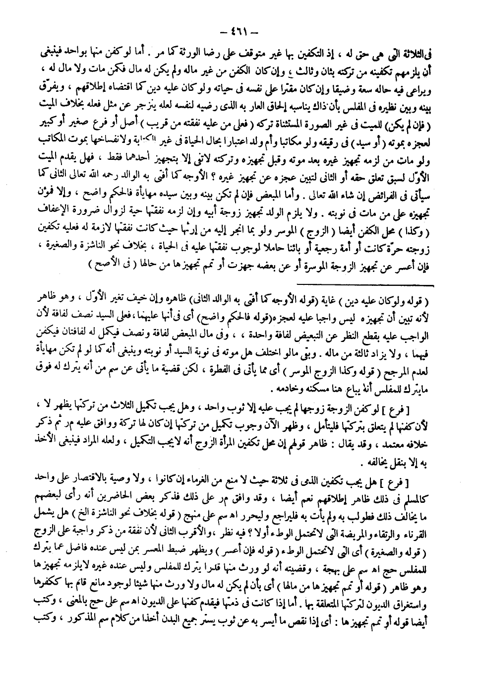 أَمَّا لَوْ كُفِّنَ مِنْهَا بِوَاحِدٍ فَيَنْبَغِي أَنْ يَلْزَمَهُمْ تَكْفِينُهُ مِنْ تَرِكَتِهِ بِثَانٍ وَثَالِثٍ، إنْ كَانَ الْكَفَنُ مِنْ غَيْرِ مَالِهِ وَلَمْ يَكُنْ لَهُ مَالٌ فَكَمَنْ مَاتَ وَلَا مَالَ لَهُ، وَيُرَاعَى فِيهِ حَالُهُ سَعَةً وَضِيقًا وَإِنْ كَانَ مُقَتِّرًا عَلَى نَفْسِهِ فِي حَيَاتِهِ وَلَوْ كَانَ عَلَيْهِ دَيْنٌ كَمَا اقْتَضَاهُ إطْلَاقُهُمْ، وَيُفَرَّقَ بَيْنَهُ وَبَيْنَ نَظِيرِهِ فِي الْمُفْلِسِ بِأَنَّ ذَاكَ يُنَاسِبُهُ إلْحَاقُ الْعَارِ بِهِ الَّذِي رَضِيَهُ لِنَفْسِهِ لَعَلَّهُ يَنْزَجِرُ عَنْ مِثْلِ فِعْلِهِ بِخِلَافِ الْمَيِّتِ (فَإِنْ لَمْ يَكُنْ) لِلْمَيِّتِ فِي غَيْرِ الصُّورَةِ الْمُسْتَثْنَاةِ تَرْكُهُ (فَعَلَى مَنْ عَلَيْهِ نَفَقَتُهُ مِنْ قَرِيبٍ) أَصْلٍ أَوْ فَرْعٍ صَغِيرٍ أَوْ كَبِيرٍ لِعَجْزِهِ بِمَوْتِهِ (أَوْ سَيِّدٍ) فِي رَقِيقِهِ وَلَوْ مُكَاتَبًا وَأُمَّ وَلَدٍ اعْتِبَارًا بِحَالِ الْحَيَاةِ فِي غَيْرِ الْكِتَابَةِ وَلِانْفِسَاخِهَا بِمَوْتِ الْمُكَاتَبِ وَلَوْ مَاتَ مَنْ لَزِمَهُ تَجْهِيزُ غَيْرِهِ بَعْدَ مَوْتِهِ وَقَبْلَ تَجْهِيزِهِ وَتِرْكَتُهُ لَا تَفِي إلَّا بِتَجْهِيزِ أَحَدِهِمَا فَقَطْ، فَهَلْ يُقَدَّمُ الْمَيِّتُ الْأَوَّلُ لِسَبْقِ تَعَلُّقِ حَقِّهِ أَوْ الثَّانِي لِتَبَيُّنِ عَجْزِهِ عَنْ تَجْهِيزِ غَيْرِهِ؟ الْأَوْجَهُ كَمَا أَفْتَى بِهِ الْوَالِدُ - رَحِمَهُ اللَّهُ تَعَالَى - الثَّانِي كَمَا سَيَأْتِي فِي الْفَرَائِضِ إنْ شَاءَ اللَّهُ تَعَالَى.