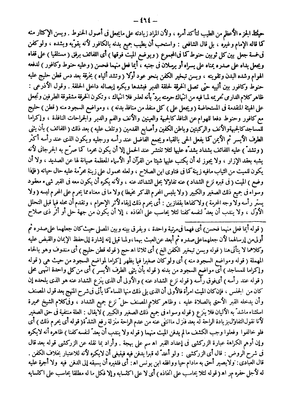 ـــــــــــــــــــــــــــــS (قَوْلُهُ: أَيَّمَا فَعَلَ مِنْهُمَا فَحَسَنٌ) أَيْ فَهُمَا فِي مَرْتَبَةٍ وَاحِدَةٍ، وَيُفَرَّقُ بَيْنَهُ وَبَيْنَ الْمُصَلِّي حَيْثُ كَانَ جَعْلُهُمَا عَلَى صَدْرِهِ ثَمَّ أَوْلَى مِنْ إرْسَالِهِمَا لِأَنَّ جَعْلَهُمَا عَلَى صَدْرِهِ ثَمَّ أَبْعَدُ عَنْ الْعَبَثِ بِهِمَا، وَلِمَا قِيلَ إنَّهُ إشَارَةٌ إلَى حِفْظِ الْإِيمَانِ وَالْقَبْضِ عَلَيْهِ وَكِلَاهُمَا لَا يَتَأَتَّى هُنَا (قَوْلُهُ وَيُسَنُّ تَبْخِيرُ الْكَفَنِ إلَخْ) أَيْ ثَلَاثًا اهـ حَجّ (قَوْلُهُ: قُطْنٌ حَلِيجٌ) أَيْ مَنْدُوفٌ وَهُوَ بِالْحَاءِ الْمُهْمَلَةِ (قَوْلُهُ: وَمَوَاضِعِ السُّجُودِ مِنْهُ) أَيْ وَلَوْ كَانَ صَغِيرًا فِيمَا يَظْهَرُ إكْرَامًا لِمَوَاضِع السُّجُودِ مِنْ حَيْثُ هِيَ (قَوْلُهُ: وَإِكْرَامًا لِلْمَسَاجِدِ) أَيْ مَوَاضِعِ السُّجُودِ مِنْ بَدَنِهِ (قَوْلُهُ: بِأَنْ يُثْنَى الطَّرَفُ الْأَيْسَرُ) أَيْ مِنْ كُلِّ وَاحِدَةٍ انْتَهَى مَحَلِّيٌّ (قَوْلُهُ عِنْدَ رَأْسِهِ) أَيْ فَوْقَ رَأْسِهِ (قَوْلُهُ: نُزِعَ الشِّدَادُ عَنْهُ) وَالْأَوْلَى أَنَّ الَّذِي يَنْزِعُ الشِّدَادَ عَنْهُ هُوَ الَّذِي يُلْحِدُهُ إنْ كَانَ مِنْ الْجِنْسِ، فَإِنْ كَانَ الْمَيِّتُ امْرَأَةً فَالْأَوْلَى أَنَّ الَّذِي يَلِي ذَلِكَ مِنْهَا النِّسَاءُ كَمَا يَأْتِي فِي شَرْحِ الْمَنْهَجِ بَعْدَ قَوْلِ الْمُصَنِّفِ وَأَنْ يَدْخُلَهُ الْقَبْرَ الْأَحَقُّ بِالصَّلَاةِ عَلَيْهِ، وَظَاهِرُ كَلَامِ الْمُصَنِّفِ حِلُّ نَزْعِ جَمِيعِ الشِّدَادِ، وَفِي كَلَامِ الشَّيْخِ عَمِيرَةَ اسْتِثْنَاءُ مَا شُدَّ بِهِ الْأَلْيَانِ فَلَا يُنْزَعُ (قَوْلُهُ وَسَوَاءٌ فِي جَمِيعِ ذَلِكَ الصَّغِيرُ وَالْكَبِيرُ) لَا يُقَالُ: الْعِلَّةُ مُنْتَفِيَةٌ فِي حَقِّ الصَّغِيرِ لِأَنَّا نَقُولُ التَّفَاؤُلُ بِزِيَادَةِ الرَّاحَةِ لَهُ بَعْدُ فَنَزَلَ مَا انْتَفَى عَنْهُ مِنْ عَدَمِ الرَّاحَةِ مَنْزِلَةَ رَفْعِ الشَّدَّةِ (قَوْلُهُ أَيْ يُحَرَّمُ ذَلِكَ) أَيْ فَلَوْ خَالَفُوا وَفَعَلُوا وَجَبَ الْكَشْفُ مَا لَمْ يُدْفَنْ الْمَيِّتُ مِنْهُمَا (قَوْلُهُ: وَلَا يُنْدَبُ أَنْ يُعِدَّ لِنَفْسِهِ كَفَنًا) ظَاهِرُهُ أَنَّهُ لَا يُكْرَهُ وَإِنْ أَوْهَمَ الْكَرَاهَةَ عِبَارَةُ الزَّرْكَشِيّ فِي إعْدَادِ الْقَبْرِ اهـ سم عَلَى بَهْجَةٍ.