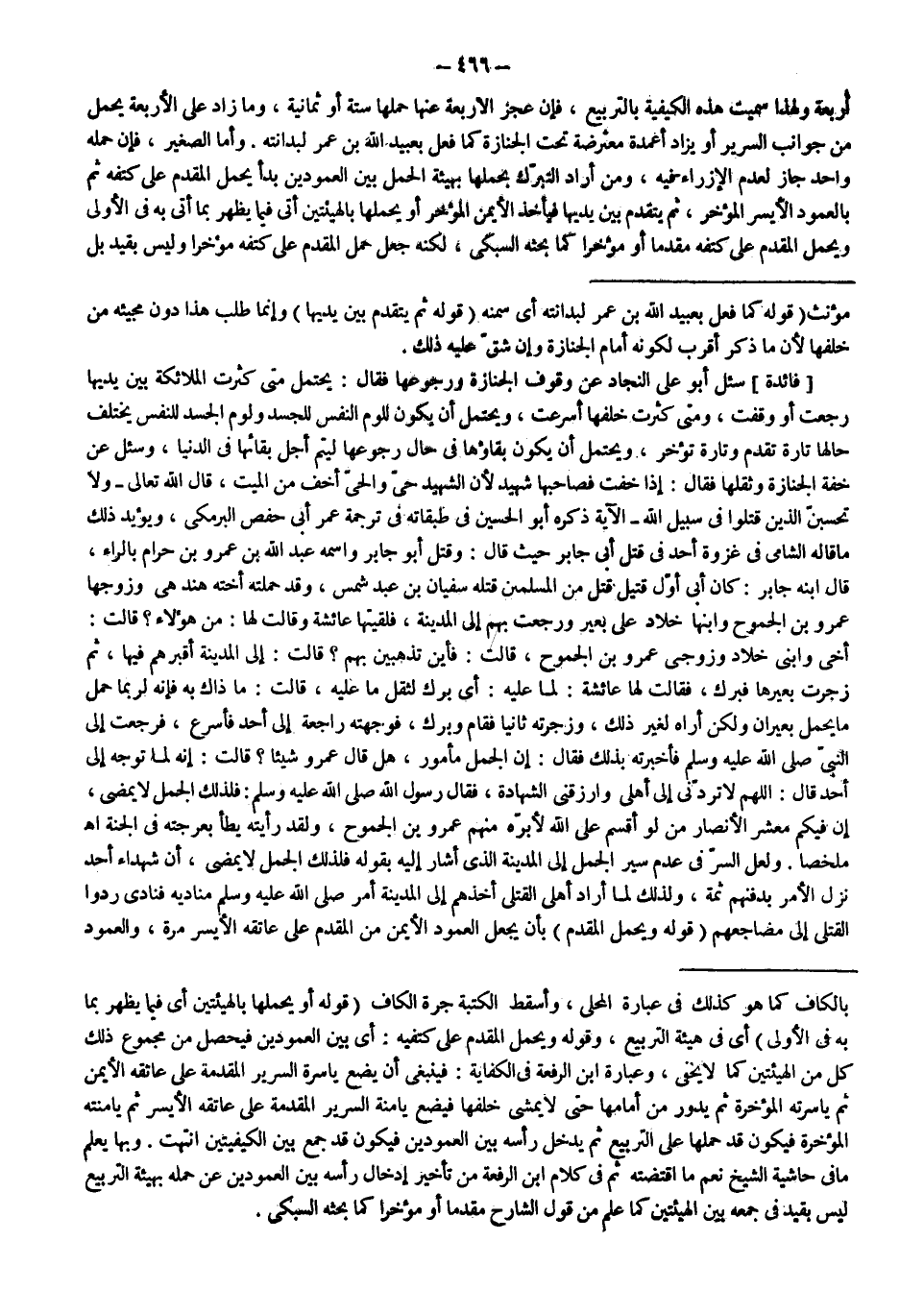 وَلَعَلَّ السِّرَّ فِي عَدَمِ سَيْرِ الْجَمَلِ إلَى الْمَدِينَةِ الَّذِي أَشَارَ إلَيْهِ بِقَوْلِهِ فَلِذَلِكَ الْجَمَلُ لَا يَمْضِي، أَنَّ شُهَدَاءَ أُحُدٍ نَزَلَ الْأَمْرُ بِدَفْنِهِمْ ثَمَّةَ، وَلِذَلِكَ لَمَّا أَرَادَ أَهْلُ الْقَتْلَى أَخْذَهُمْ إلَى الْمَدِينَةِ أَمَرَ - صَلَّى اللَّهُ عَلَيْهِ وَسَلَّمَ - مُنَادِيَهُ فَنَادَى رُدُّوا الْقَتْلَى إلَى مَضَاجِعِهِمْ (قَوْلُهُ: وَيَحْمِلُ الْمُقَدَّمَ) بِأَنْ يَجْعَلَ الْعَمُودَ الْأَيْمَنَ مِنْ الْمُقَدَّمِ عَلَى عَاتِقِهِ الْأَيْسَرِ مَرَّةً، وَالْعَمُودَ