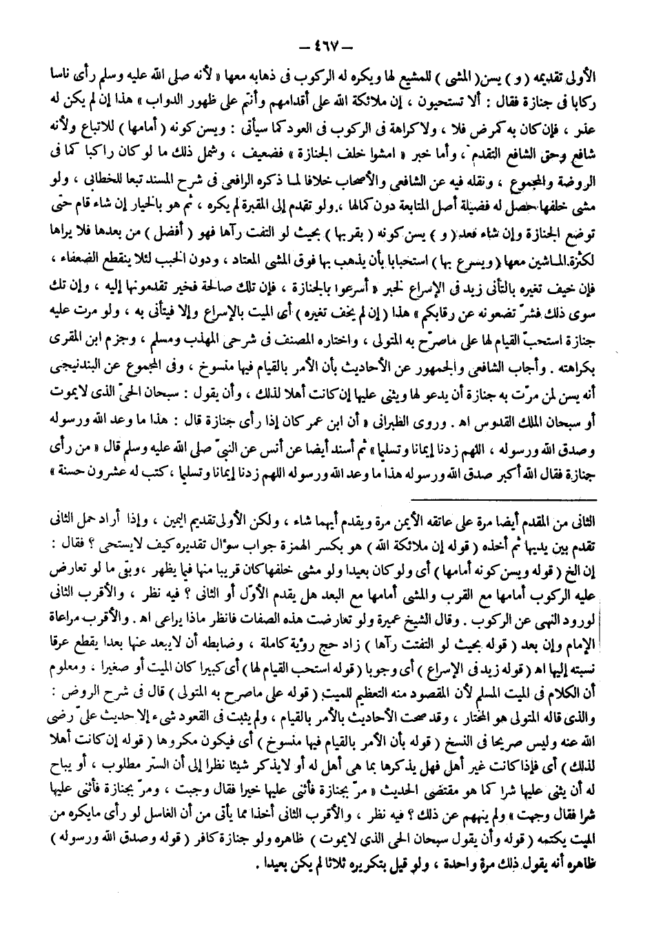 الْأَوْلَى تَقْدِيمُهُ (وَ) يُسَنُّ (الْمَشْيُ) لِلْمُشَيِّعِ لَهَا وَيُكْرَهُ لَهُ الرُّكُوبُ فِي ذَهَابِهِ مَعَهَا "؛ لِأَنَّهُ «- صَلَّى اللَّهُ عَلَيْهِ وَسَلَّمَ - رَأَى نَاسًا رُكَّابًا فِي جِنَازَةٍ فَقَالَ: أَلَا تَسْتَحْيُونَ، إنَّ مَلَائِكَةَ اللَّهِ عَلَى أَقْدَامِهِمْ وَأَنْتُمْ عَلَى ظُهُورِ الدَّوَابِّ» هَذَا إنْ لَمْ يَكُنْ لَهُ عُذْرٌ، فَإِنْ كَانَ بِهِ كَمَرَضٍ فَلَا، وَلَا كَرَاهَةَ فِي الرُّكُوبِ فِي الْعَوْدِ كَمَا سَيَأْتِي:.