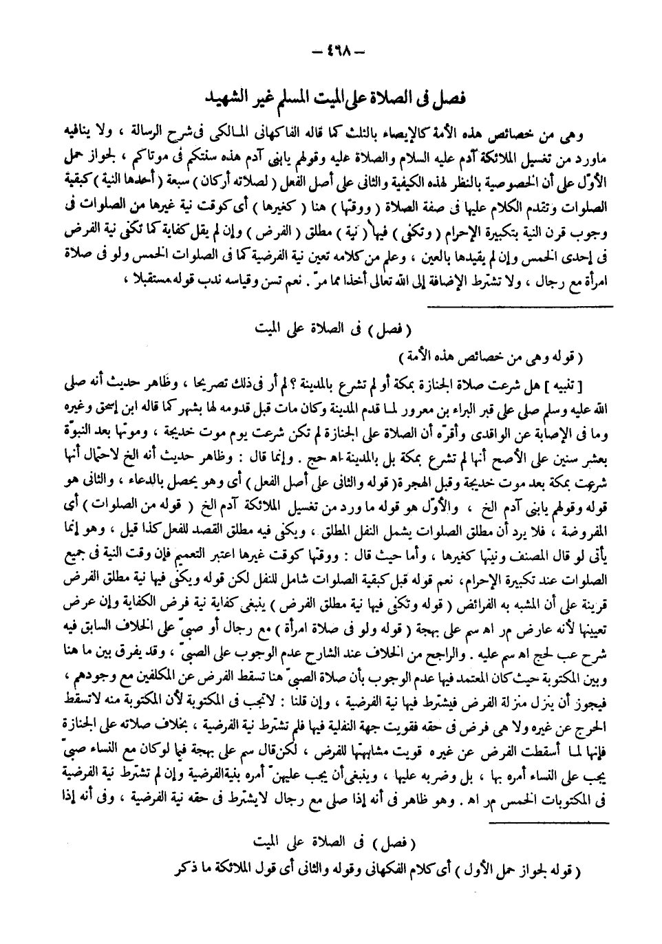 ـــــــــــــــــــــــــــــQفَصْلٌ) فِي الصَّلَاةِ عَلَى الْمَيِّتِ (قَوْلُهُ: لِجَوَازِ حَمْلِ الْأُوَلِ) أَيْ كَلَامُ الْفَاكِهَانِيِّ وَقَوْلُهُ: وَالثَّانِي أَيْ قَوْلُ الْمَلَائِكَةِ مَا ذُكِرَ