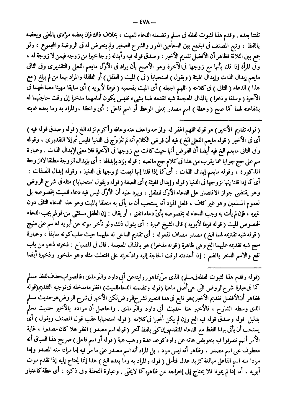 وَعِبَارَةُ سم عَلَى حَجّ جَوَابًا عَمَّا يَقْرَبُ مِنْ هَذَا فِي كَلَامِ حَجّ مَا نَصُّهُ: قَوْلُهُ يُرَادُ بِإِبْدَالِهَا: أَيْ بِإِبْدَالِ الزَّوْجَةِ مُطْلَقًا لَا الزَّوْجَةِ الْمَذْكُورَةِ، وَقَوْلُهُ مَا يَعُمُّ إبْدَالَ الذَّاتِ: أَيْ كَمَا إذَا قُلْنَا إنَّهَا لَيْسَتْ لِزَوْجِهَا فِي الدُّنْيَا، وَقَوْلُهُ إبْدَالَ الصِّفَاتِ: أَيْ كَمَا إذَا قُلْنَا إنَّهَا لِزَوْجِهَا فِي الدُّنْيَا (قَوْلُهُ: وَإِبْدَالَ الْهَيْئَةِ) أَيْ الصِّفَةِ (قَوْلُهُ: وَيَقُولُ اسْتِحْبَابًا) مِثْلُهُ فِي شَرْحِ الرَّوْضِ وَهُوَ يَقْتَضِي جَوَازَ الِاقْتِصَارِ عَلَى الدُّعَاءِ الْأَوَّلِ لِلطِّفْلِ، وَيَرُدُّ عَلَيْهِ أَنَّ الْأَوَّلَ لَيْسَ فِيهِ دُعَاءٌ لِلْمَيِّتِ بِخُصُوصِهِ بَلْ لِعُمُومِ الْمُسْلِمِينَ وَهُوَ غَيْرُ كَافٍ، فَلَعَلَّ الْمُرَادَ أَنَّهُ يُسْتَحَبُّ أَنَّ مَا يَأْتِي بِهِ مُتَعَلِّقًا بِالْمَيِّتِ وَهُوَ هَذَا الدُّعَاءُ الثَّانِي دُونَ غَيْرِهِ، فَإِنْ لَمْ يَأْتِ بِهِ وَجَبَ الدُّعَاءُ لَهُ بِخُصُوصِهِ بِأَيِّ دُعَاءٍ اُتُّفِقَ، أَوْ يُقَالُ: إنَّ الطِّفْلَ مُسْتَثْنًى مِنْ قَوْلِهِمْ يَجِبُ الدُّعَاءُ لِخُصُوصِ الْمَيِّتِ (قَوْلُهُ: فَرَطًا لِأَبَوَيْهِ) قَالَ الشَّيْخُ عَمِيرَةُ: أَيْ يَقُولُ ذَلِكَ وَلَوْ تَأَخَّرَ مَوْتُهُ عَنْ أَبَوَيْهِ اهـ سم عَلَى مَنْهَجٍ (قَوْلُهُ شَبَّهَ تَقْدِيمَهُ لَهُمَا إلَخْ) مَصْدَرٌ مُضَافٌ لِمَفْعُولِهِ: أَيْ تَقْدِيمَ الدَّاعِي لَهُ عَلَيْهِمَا حَيْثُ طَلَبَ كَوْنَهُ سَابِقًا، وَعِبَارَةُ حَجّ شَبَّهَ تَقْدِيمَهُ عَلَيْهِمَا إلَخْ وَهِيَ ظَاهِرَةٌ (قَوْلُهُ: مُدَّخَرًا) هُوَ بِالذَّالِ الْمُعْجَمَةِ.