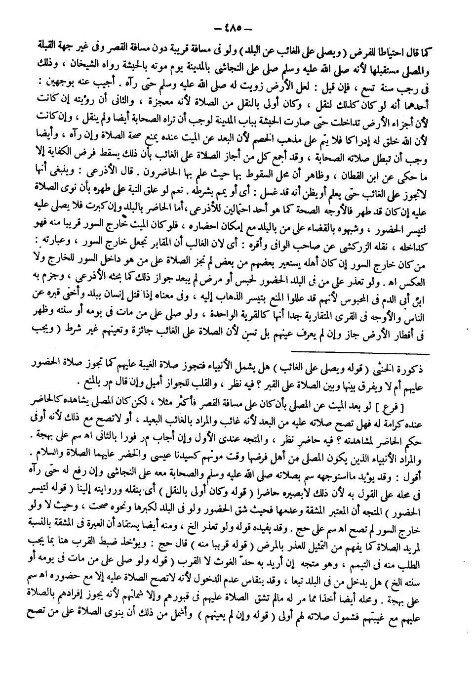 [فَرْعٌ] لَوْ بَعُدَ الْمَيِّتُ عَنْ الْمُصَلِّي بِأَنْ كَانَ عَلَى مَسَافَةِ الْقَصْرِ فَأَكْثَرَ مَثَلًا، لَكِنْ كَانَ الْمُصَلِّي يُشَاهِدُهُ كَالْحَاضِرِ عِنْدَهُ كَرَامَةً لَهُ فَهَلْ تَصِحُّ صَلَاتُهُ عَلَيْهِ مِنْ الْبُعْدِ لِأَنَّهُ غَائِبٌ وَالْمُرَادُ بِالْغَائِبِ الْبَعِيدُ، أَوْ لَا تَصِحُّ مَعَ ذَلِكَ لِأَنَّهُ أُوفِيَ حُكْمَ الْحَاضِرِ لِمُشَاهَدَتِهِ فِيهِ حَاضِرَ نَظَرٍ، وَالْمُتَّجَهُ عِنْدِي الْأَوَّلُ وَإِنْ أَجَابَ م ر فَوْرًا بِالثَّانِي اهـ سم عَلَى بَهْجَةٍ، وَالْمُرَادُ الْأَنْبِيَاءُ الَّذِينَ يَكُونُ الْمُصَلِّي مِنْ أَهْلِ فَرْضِهَا وَقْتَ مَوْتِهِمْ كَسَيِّدِنَا عِيسَى وَالْخَضِرِ - عَلَيْهِمَا الصَّلَاةُ وَالسَّلَامُ -.