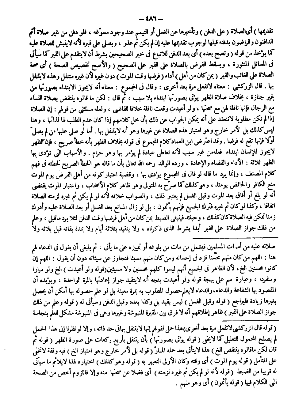 قَوْلُهُ: قَالَ الزَّرْكَشِيُّ لَا تُفْعَلُ مَرَّةً بَعْدَ أُخْرَى) هَذَا حَمْلٌ لِقَوْلِهِمْ إنَّهَا لَا يُتَنَفَّلُ بِهَا فِي حَدِّ ذَاتِهِ، وَإِلَّا لَوْ نَظَرْنَا إلَى هَذَا الْحَمْلِ لَمْ يَصْلُحْ الْمَحْمُولُ لِلتَّعْلِيلِ كَمَا لَا يَخْفَى (قَوْلُهُ: يُؤْتَى بِصُورَتِهَا) بِأَنْ يُتَنَفَّلَ بِأَرْبَعِ رَكَعَاتٍ عَلَى صُورَةِ الظُّهْرِ (قَوْلُهُ: ثُمَّ قَالَ لَكِنَّ مَا قَالُوهُ يُنْتَقَضُ إلَخْ) هَذَا لَا يَتَأَتَّى بَعْدَ حَمْلِهِ الْمَارِّ (قَوْلُهُ: بَلْ لِأَمْرٍ خَارِجٍ وَهُوَ امْتِيَازٌ إلَخْ) فِيهِ وَقْفَةٌ لَا تَخْفَى عَلَى الْمُتَأَمِّلِ (قَوْلُهُ: يَوْمَ الْمَوْتِ) أَيْ وَقْتَهُ وَكَانَ الْأَوْلَى التَّعْبِيرَ بِهِ (قَوْلُهُ: وَهُوَ كَذَلِكَ) اخْتِيَارُهُ لِهَذَا لَا يُلَائِمُ مَا سَيَأْتِي لَهُ قَرِيبًا مِنْ الضَّبْطِ (قَوْلُهُ:؛ لِأَنَّهُ لَوْ لَمْ يَكُنْ ثَمَّ غَيْرُهُ لَزِمَتْهُ) أَيْ فَضْلًا عَنْ صِحَّتِهَا مِنْهُ، وَإِلَّا فَاللُّزُومُ أَخَصُّ مِنْ الصِّحَّةِ الَّتِي الْكَلَامُ فِيهِ (قَوْلُهُ: يَأْثَمُونَ) أَيْ وَهُوَ مِنْهُمْ.